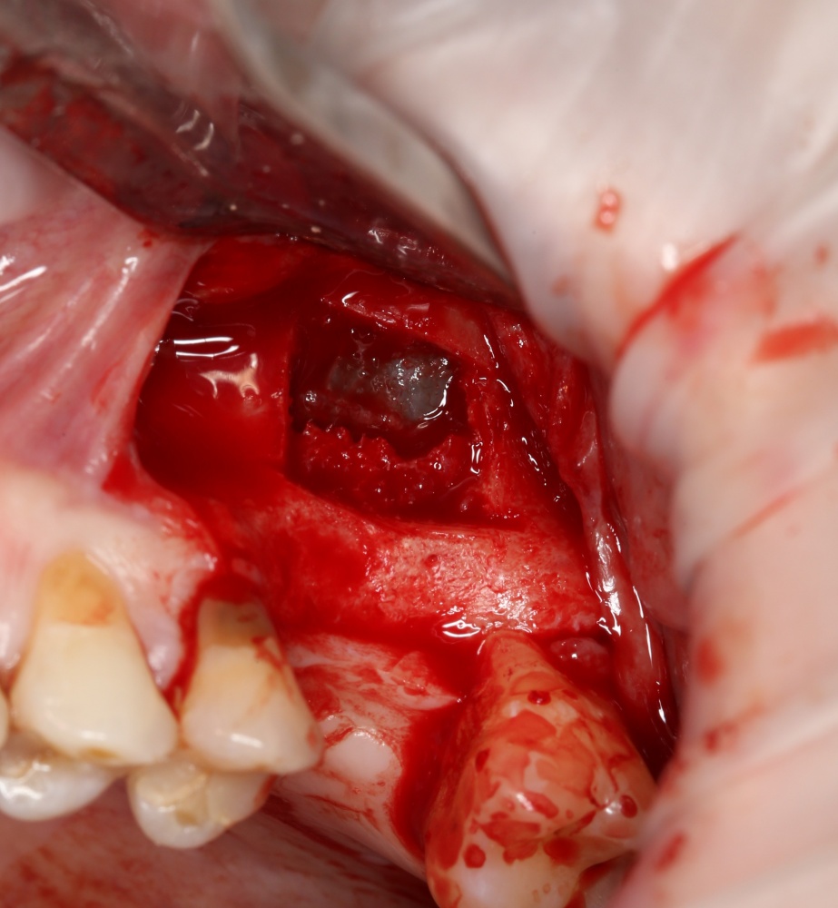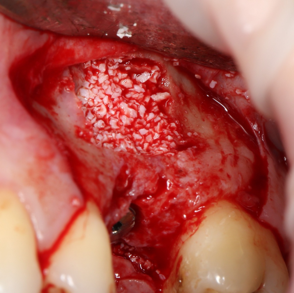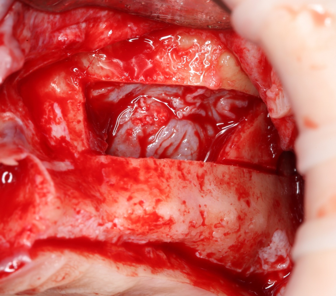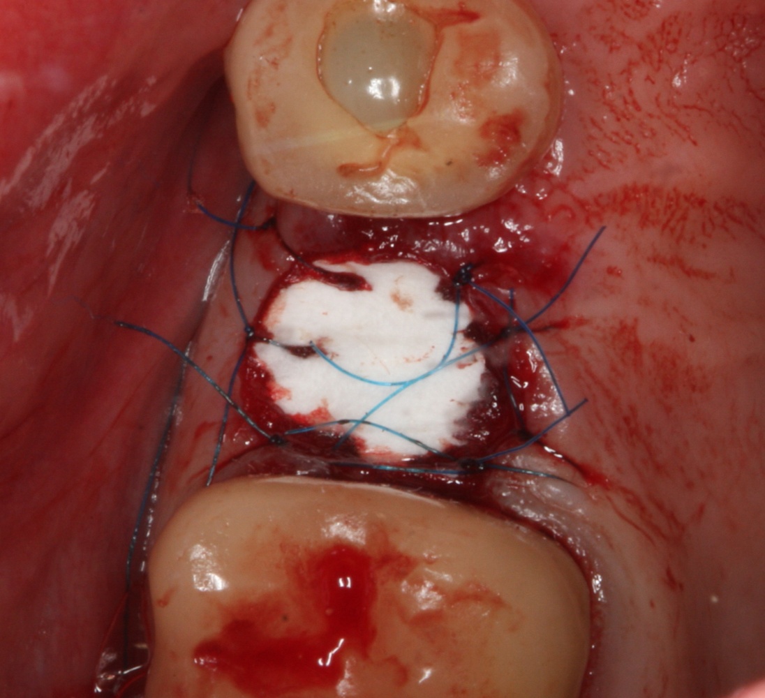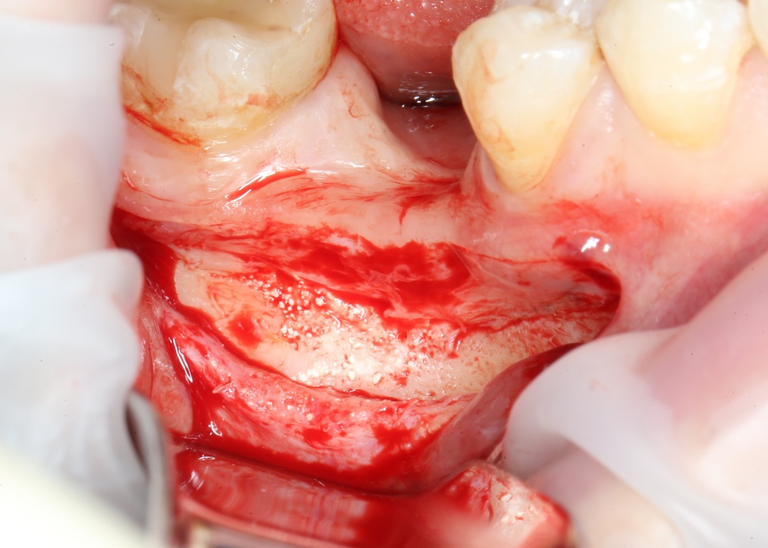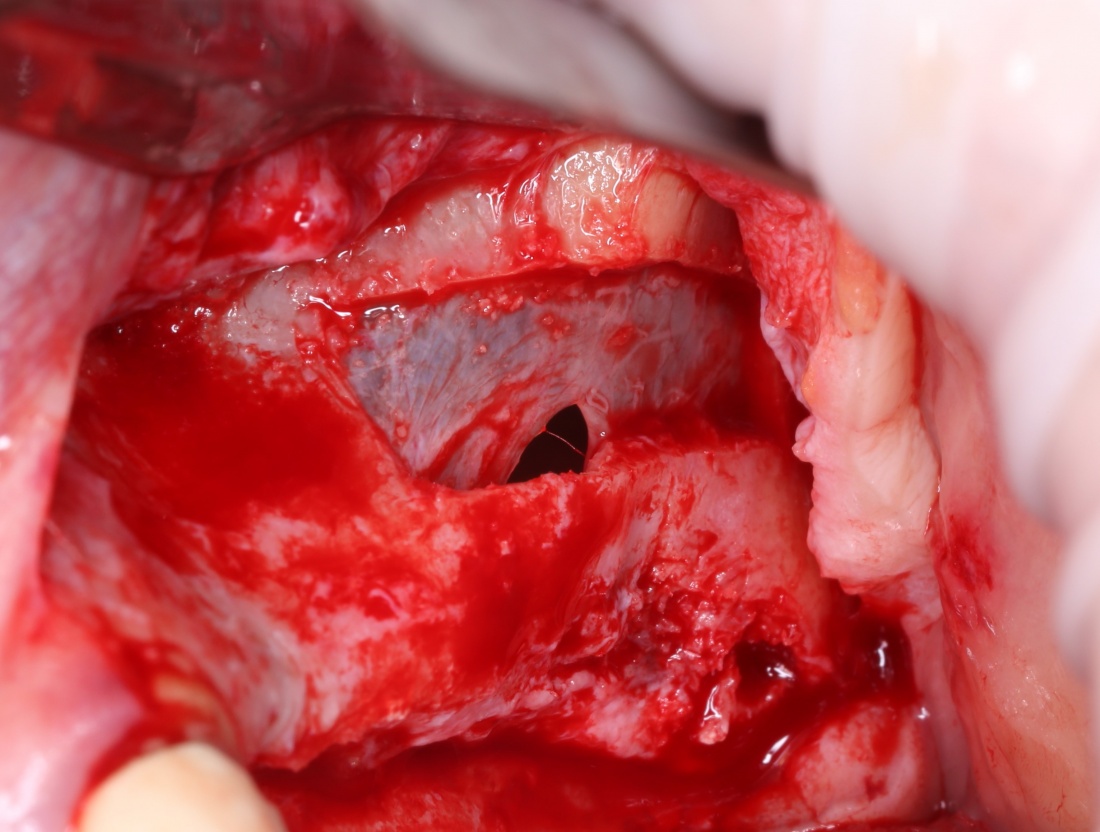 Конкретно в этом клиническом случае между костным аутотрансплантатом, ложем и имплантатами есть пустое пространство. Если его не изолировать от мягких тканей, они прорастут и осложнят интеграцию аутографта. Поэтому я решил перекрыть костный блок барьерной мембраной, пусть это делает хирургическую операцию немного дороже.