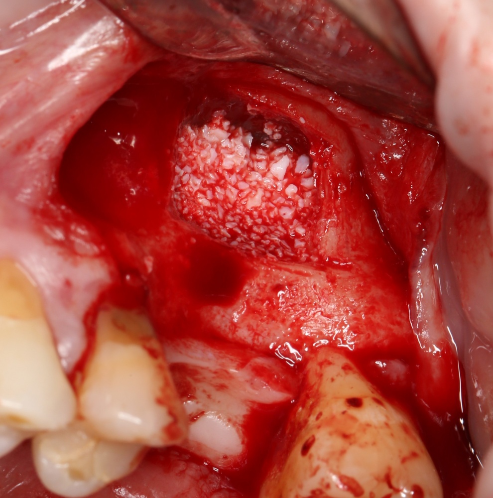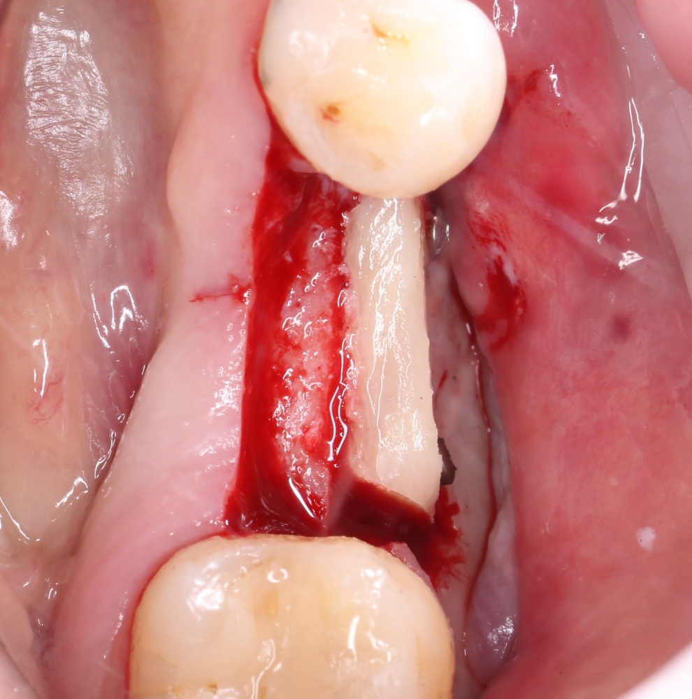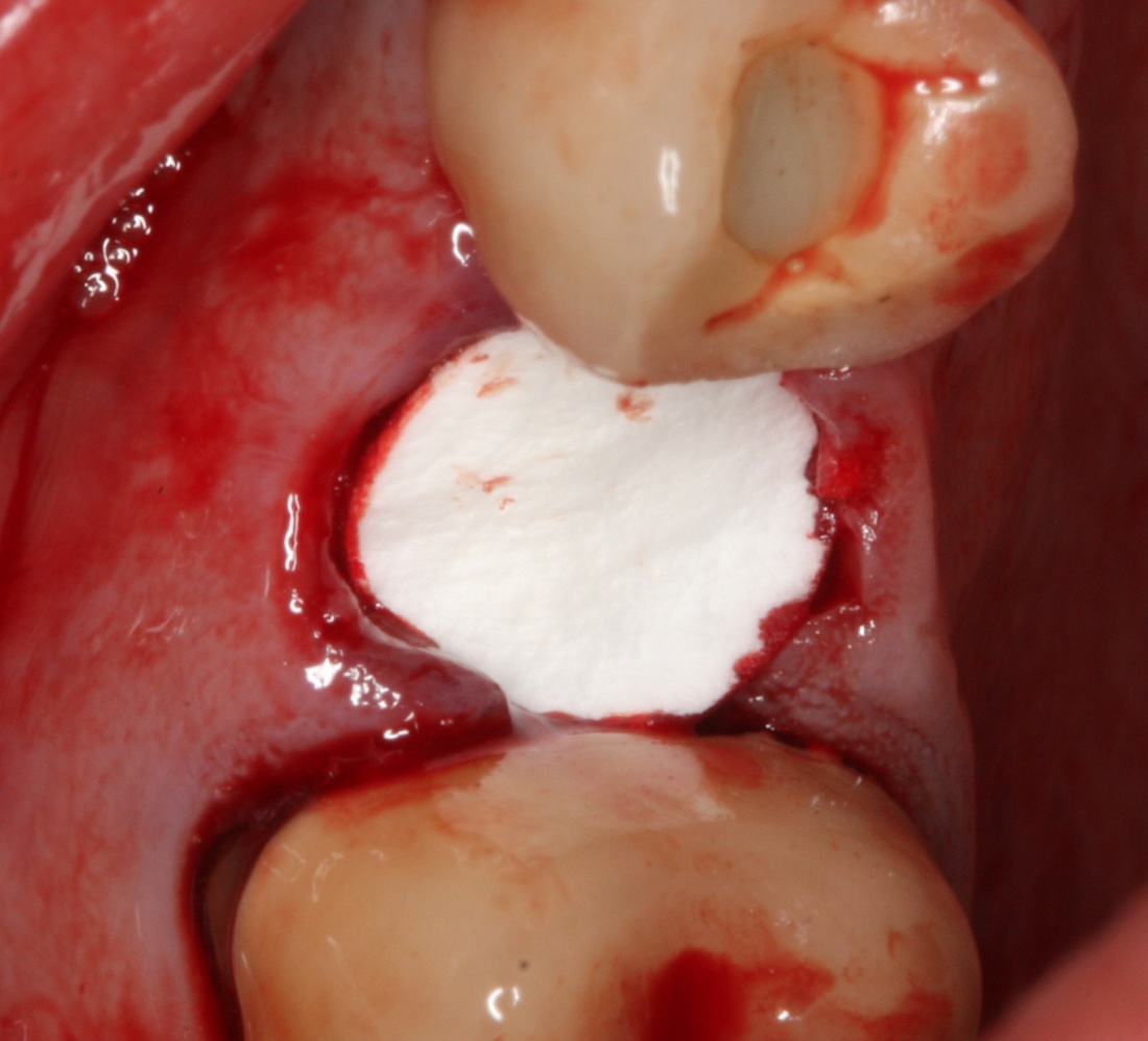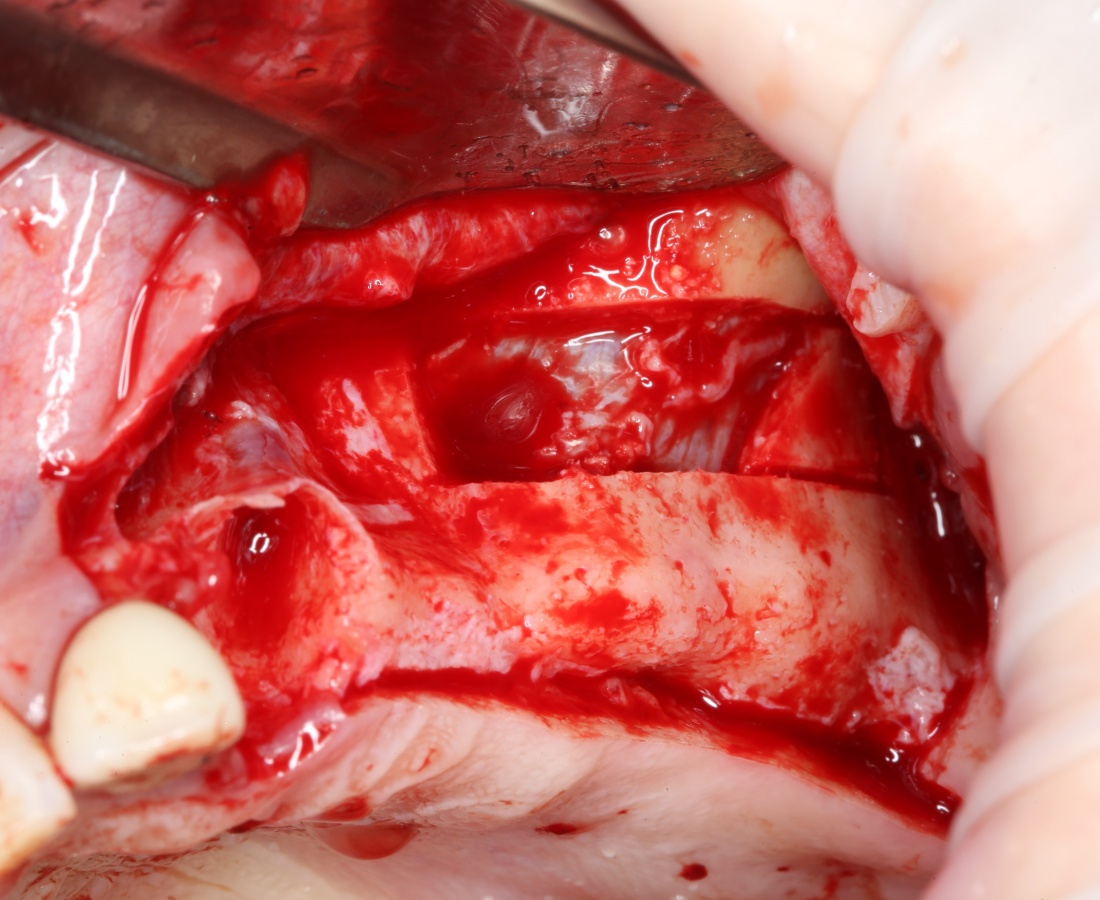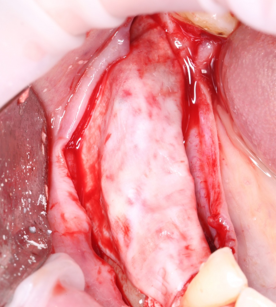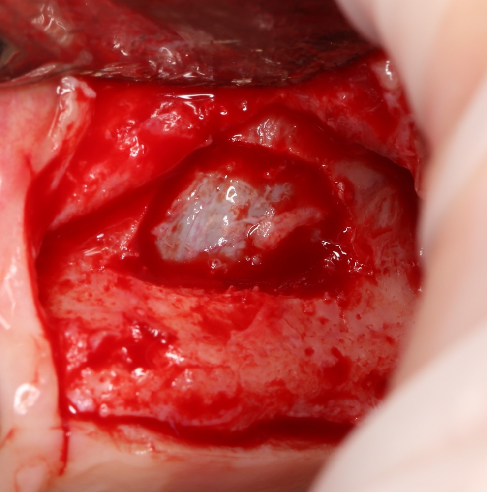 Конкретно в этом клиническом случае между костным аутотрансплантатом, ложем и имплантатами есть пустое пространство. Если его не изолировать от мягких тканей, они прорастут и осложнят интеграцию аутографта. Поэтому я решил перекрыть костный блок барьерной мембраной, пусть это делает хирургическую операцию немного дороже.
