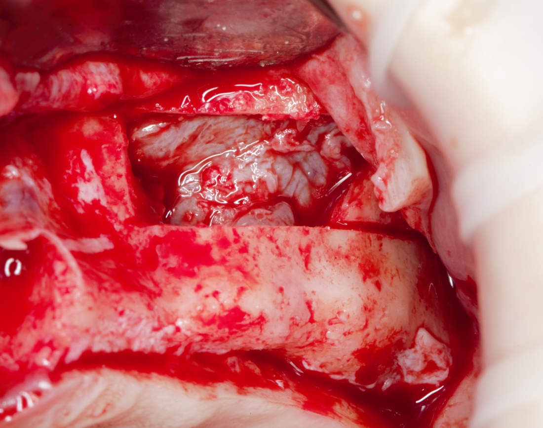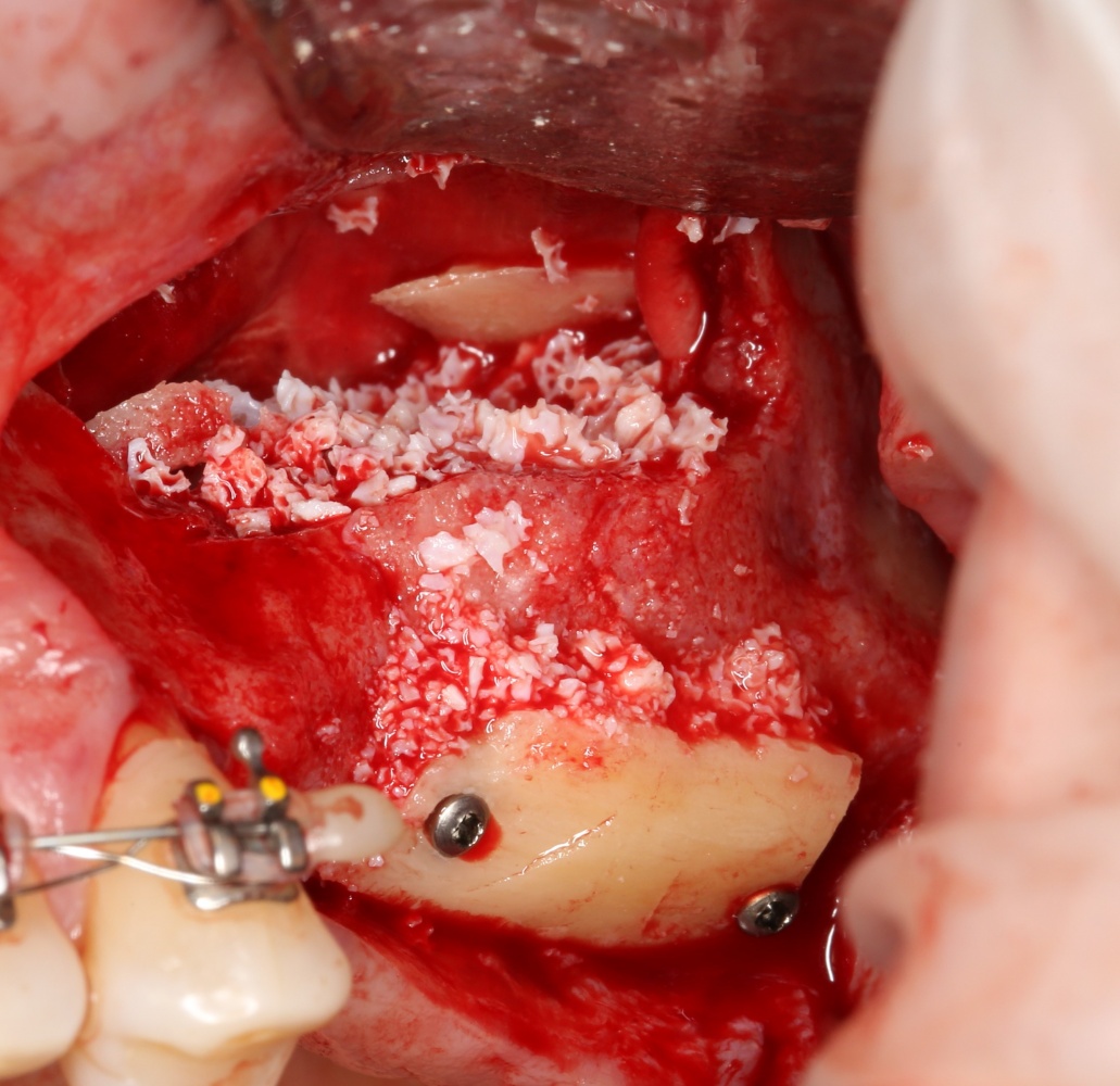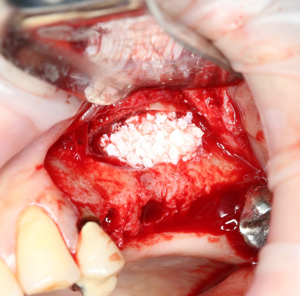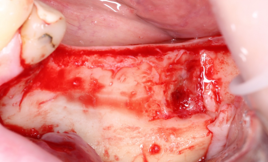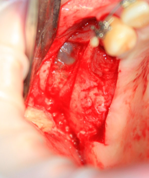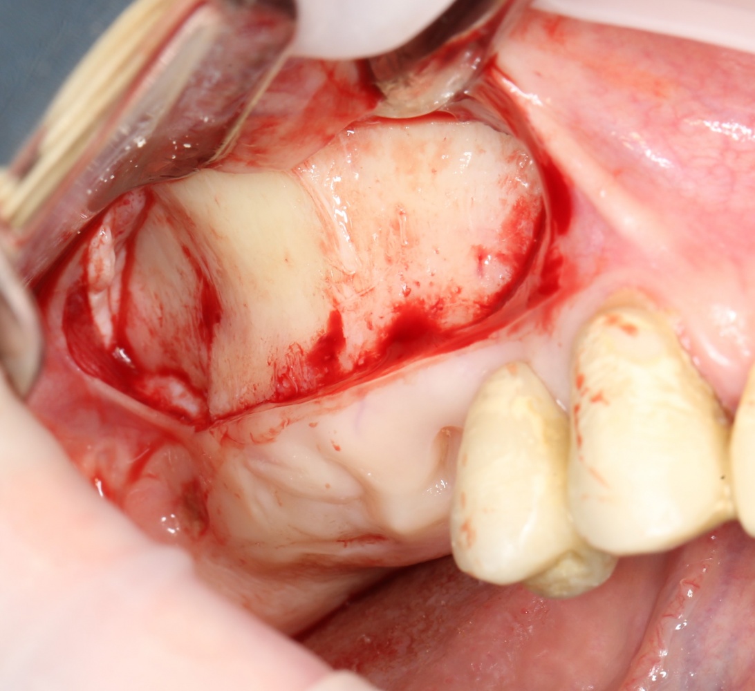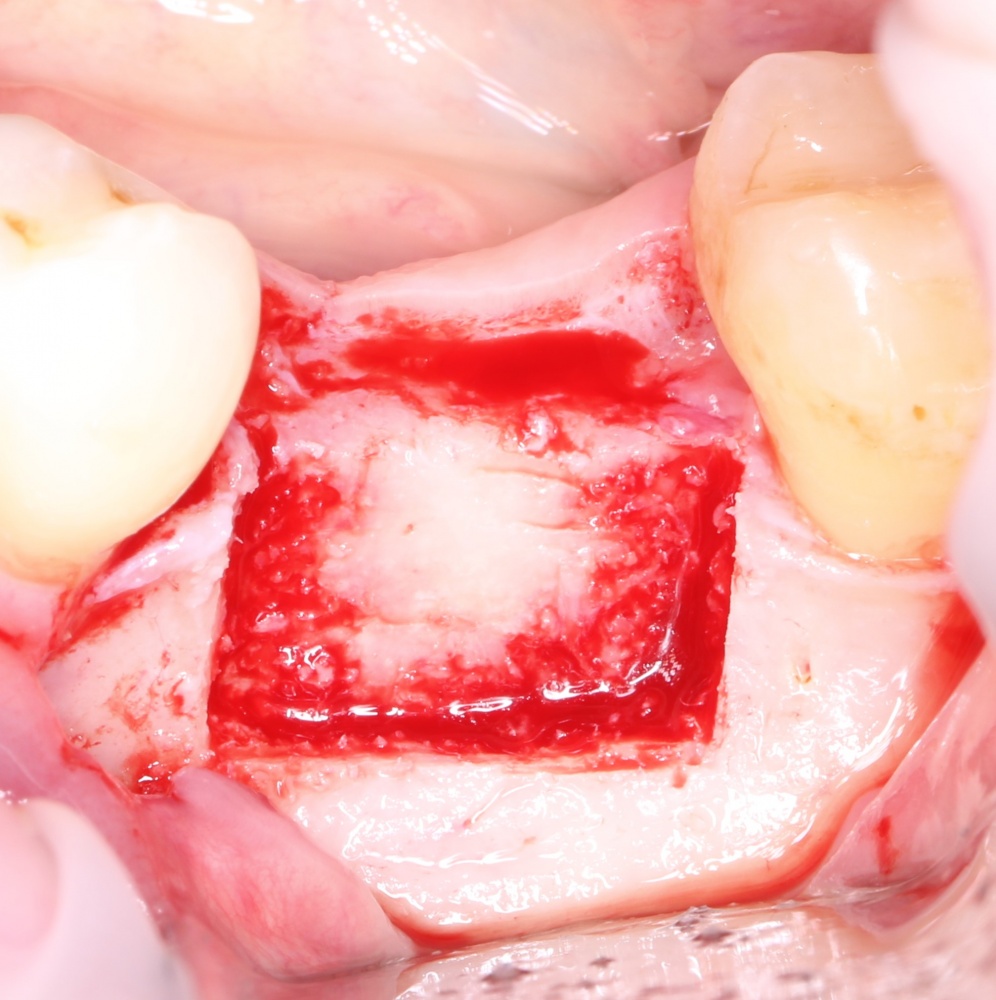 Конкретно в этом клиническом случае между костным аутотрансплантатом, ложем и имплантатами есть пустое пространство. Если его не изолировать от мягких тканей, они прорастут и осложнят интеграцию аутографта. Поэтому я решил перекрыть костный блок барьерной мембраной, пусть это делает хирургическую операцию немного дороже.