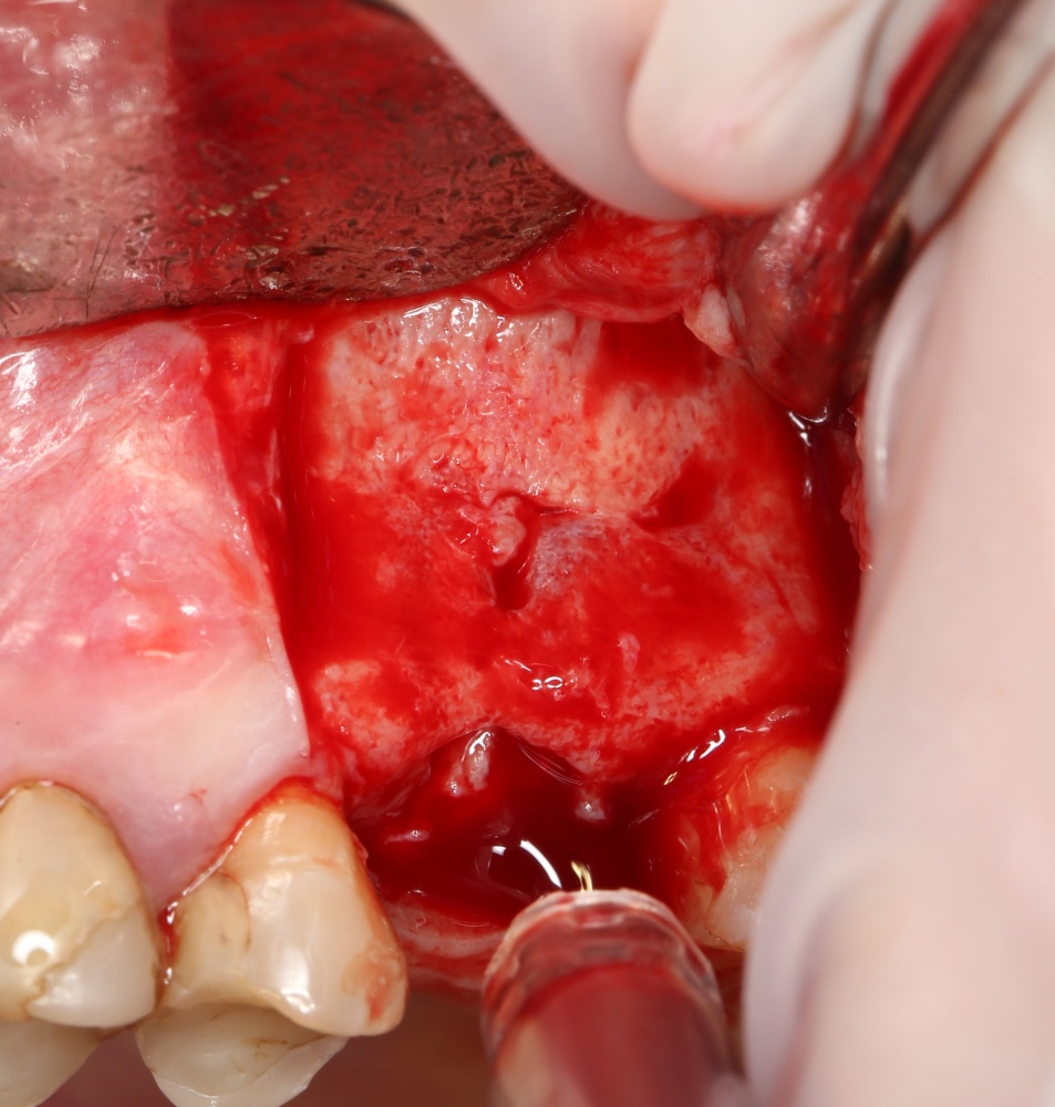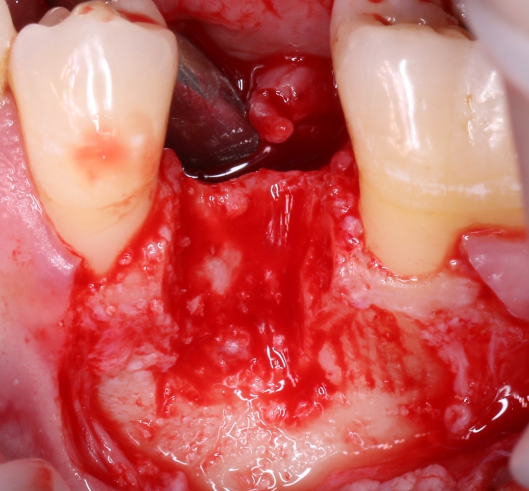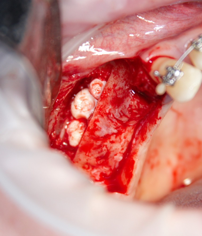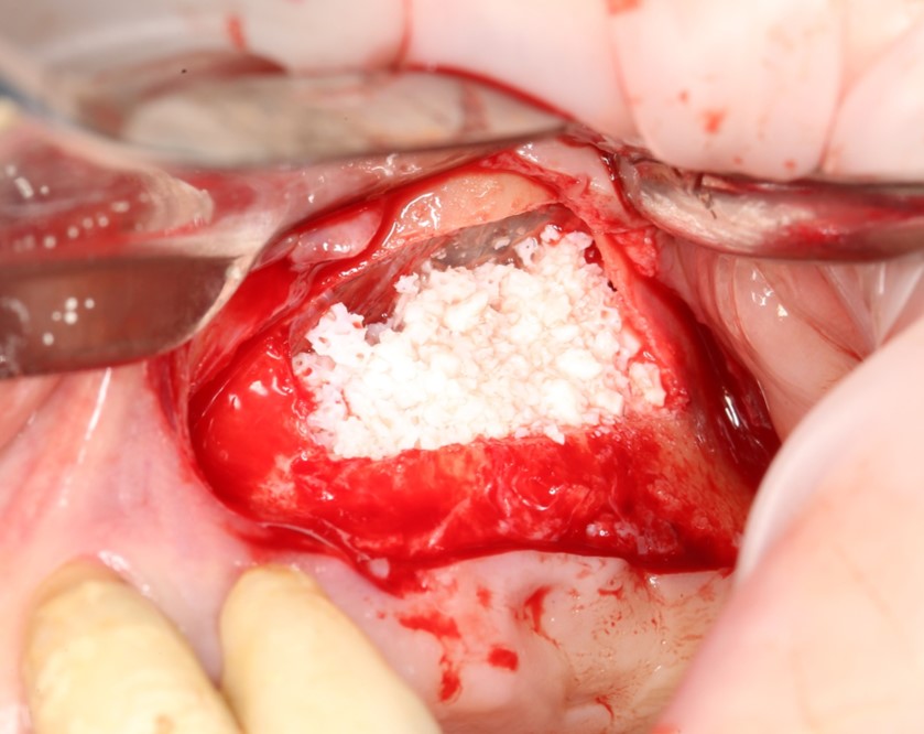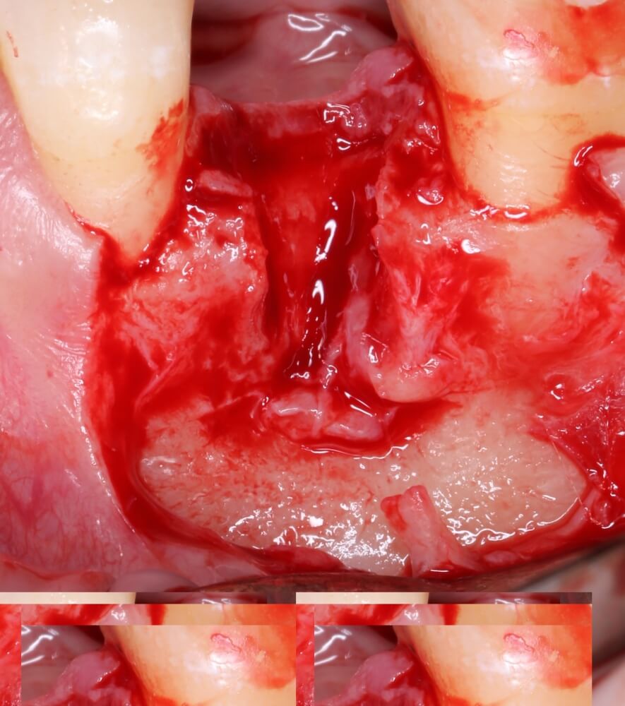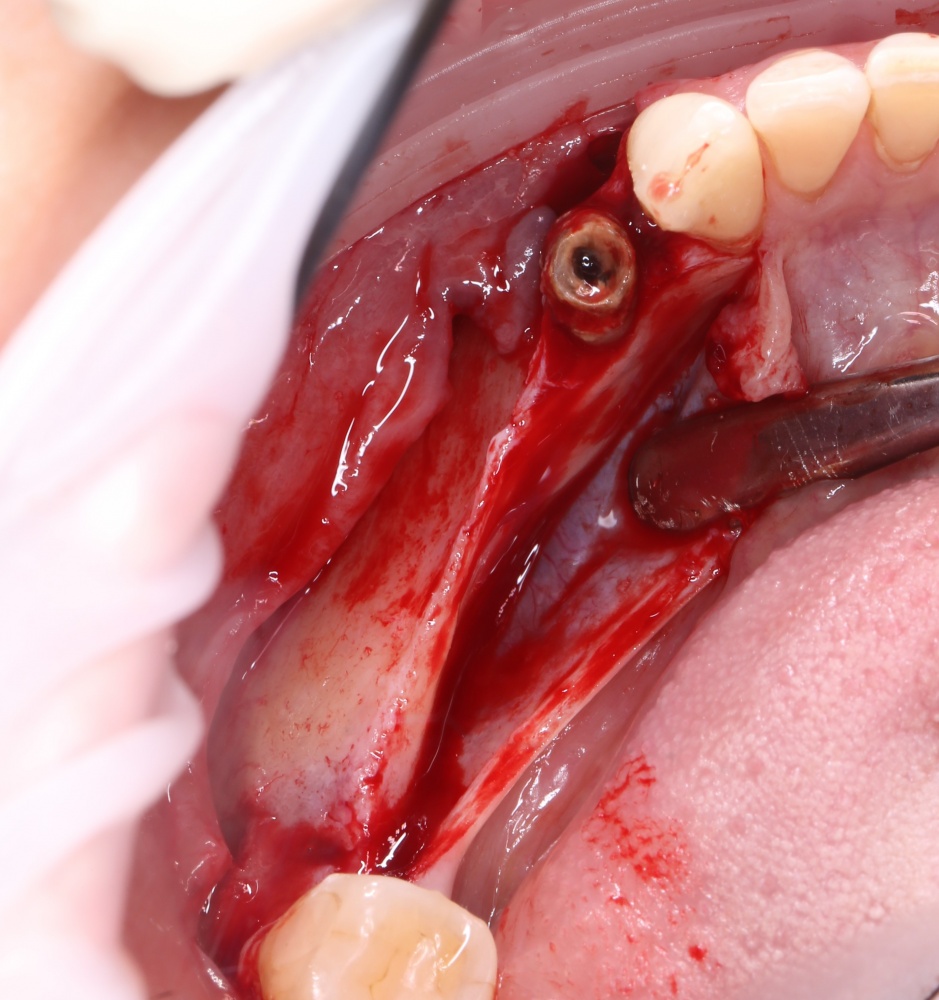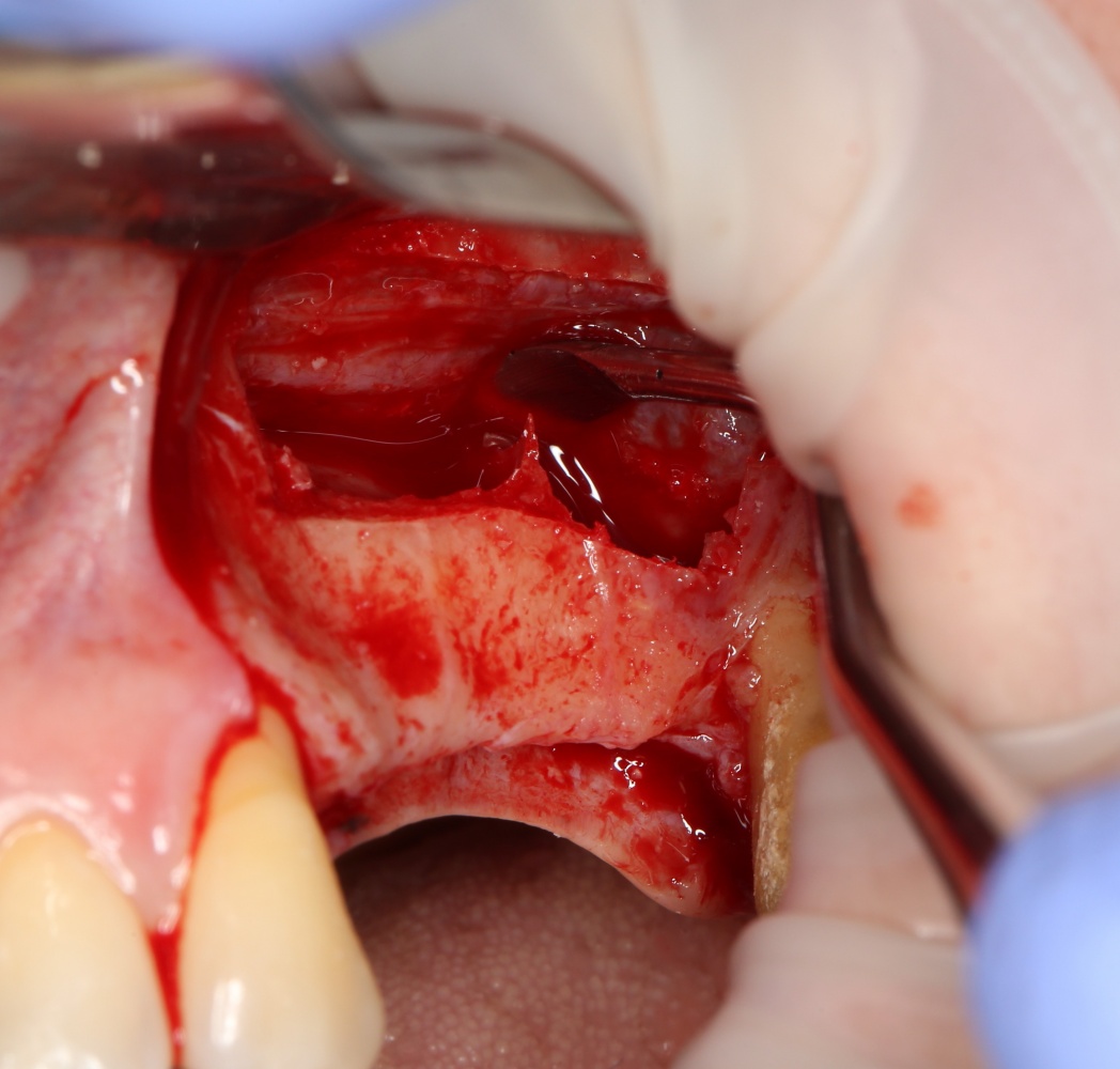 Конкретно в этом клиническом случае между костным аутотрансплантатом, ложем и имплантатами есть пустое пространство. Если его не изолировать от мягких тканей, они прорастут и осложнят интеграцию аутографта. Поэтому я решил перекрыть костный блок барьерной мембраной, пусть это делает хирургическую операцию немного дороже.