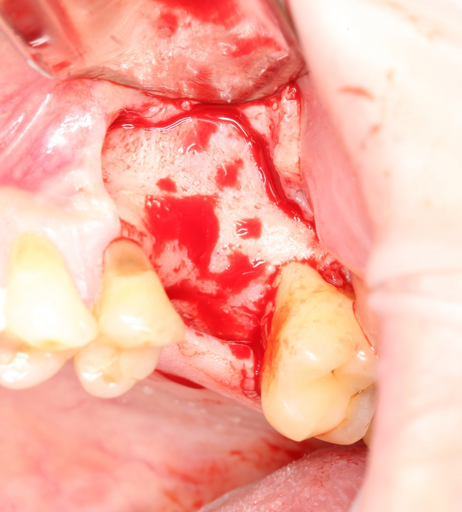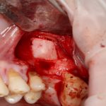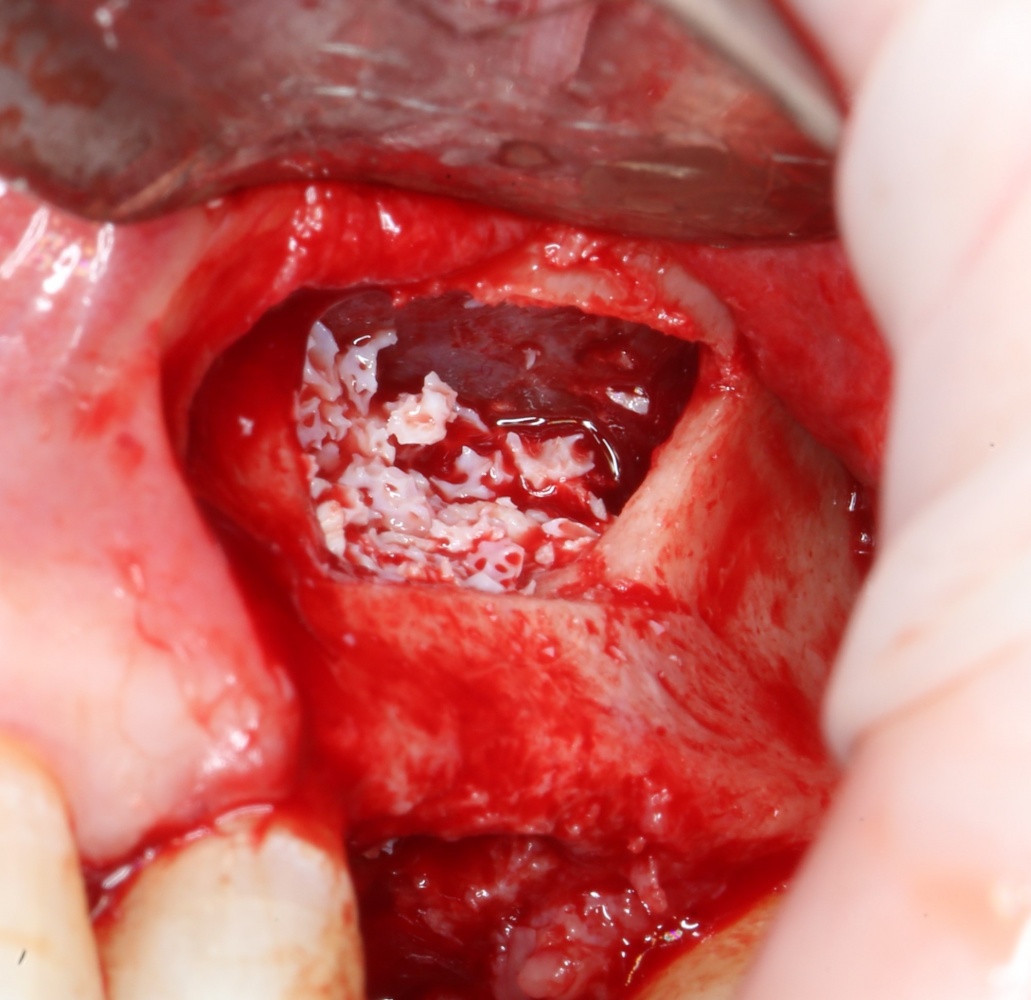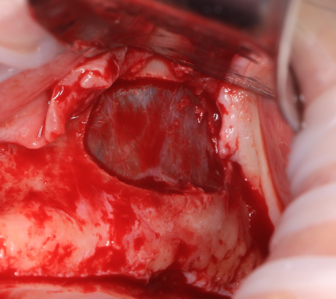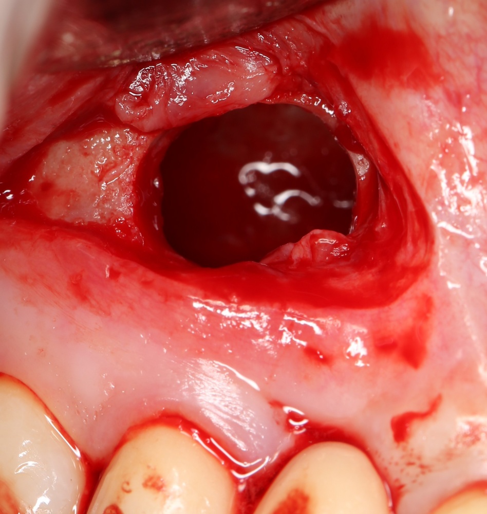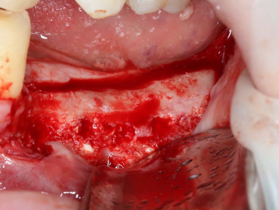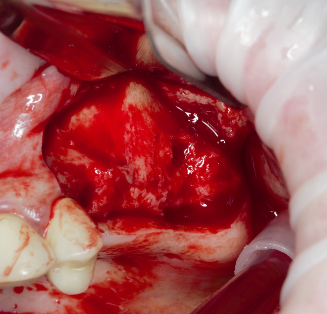 Конкретно в этом клиническом случае между костным аутотрансплантатом, ложем и имплантатами есть пустое пространство. Если его не изолировать от мягких тканей, они прорастут и осложнят интеграцию аутографта. Поэтому я решил перекрыть костный блок барьерной мембраной, пусть это делает хирургическую операцию немного дороже.