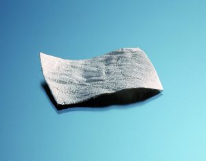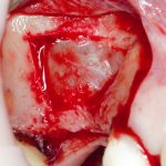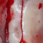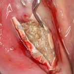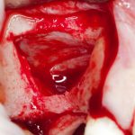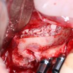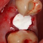 — я использовал барьерную мембрану Geistlich Bio-Gide, которая имеет две разные поверхности: с одной стороны она рыхлая «адгезивная», с другой — гладкая и прочная. Как укладывать — на результат не влияет, но в плане удобства рыхлую поверхность мы «приклеиваем» к тому, на чем требуется барьерную мембрану удержать. В данном случае хотелось бы удержать её на костной поверхности — следовательно, мы укладываем её рыхлой поверхностью к кости.