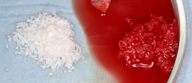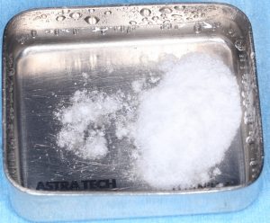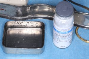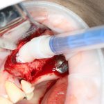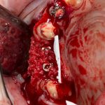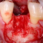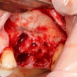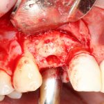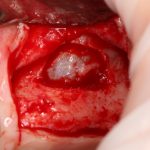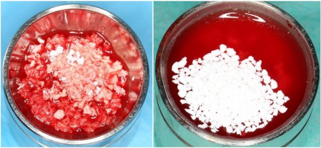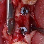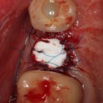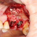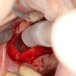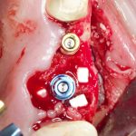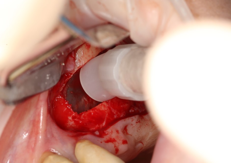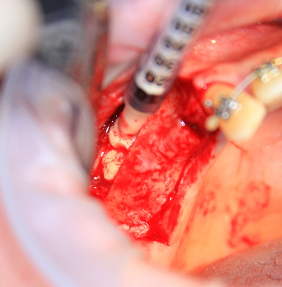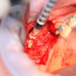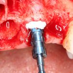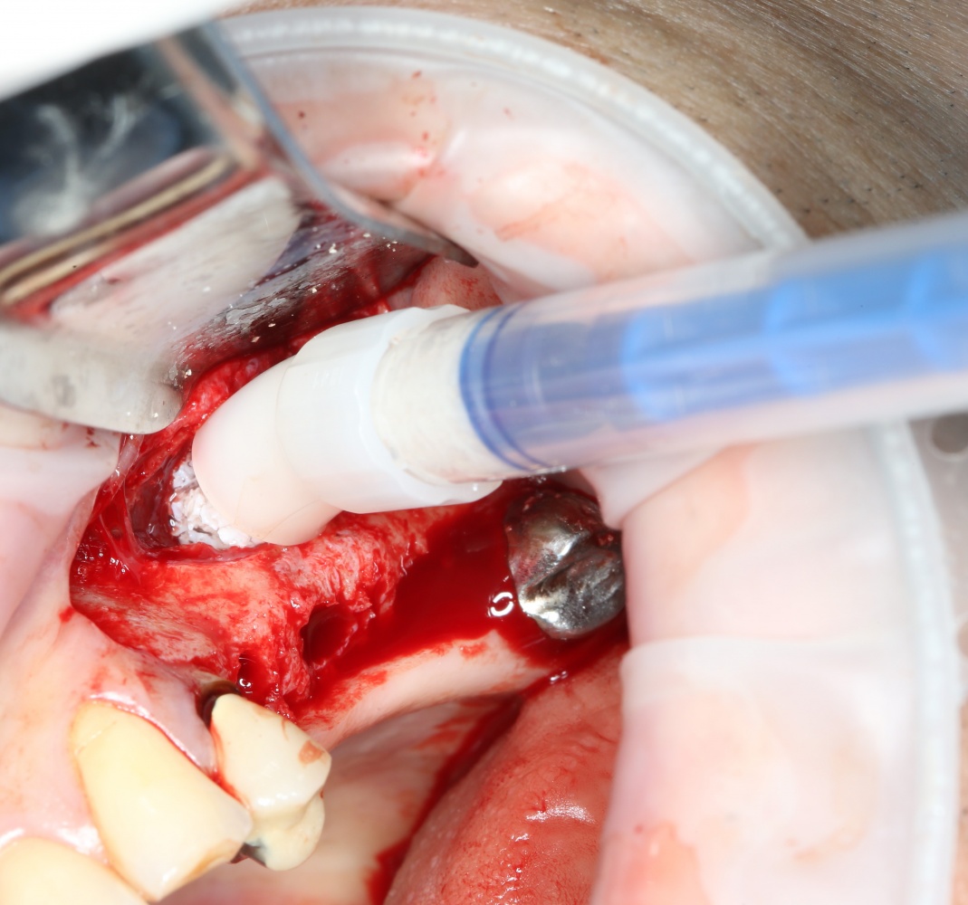 — много лет мы используем антибиотики для интраоперационной профилактики инфекционно-воспалительных осложнений. Уже в то время мы пришли к выводу, что удобнее всего — порошки антибактериальных препаратов для приготовления раствором: дешевые, стерильные, в удобной упаковке. Прямо в виде порошка их можно добавлять в графт, растворы для ирригации, либо использовать так, как показано на фото. Еще мы используем порошок антибиотика для изготовления пасты, которой обрабатываем имплантаты в процессе ревизии или при лечении периимплантита. Это удобнее и эффективнее, чем интраоперационное использование жидких форм антибактериальных препаратов.