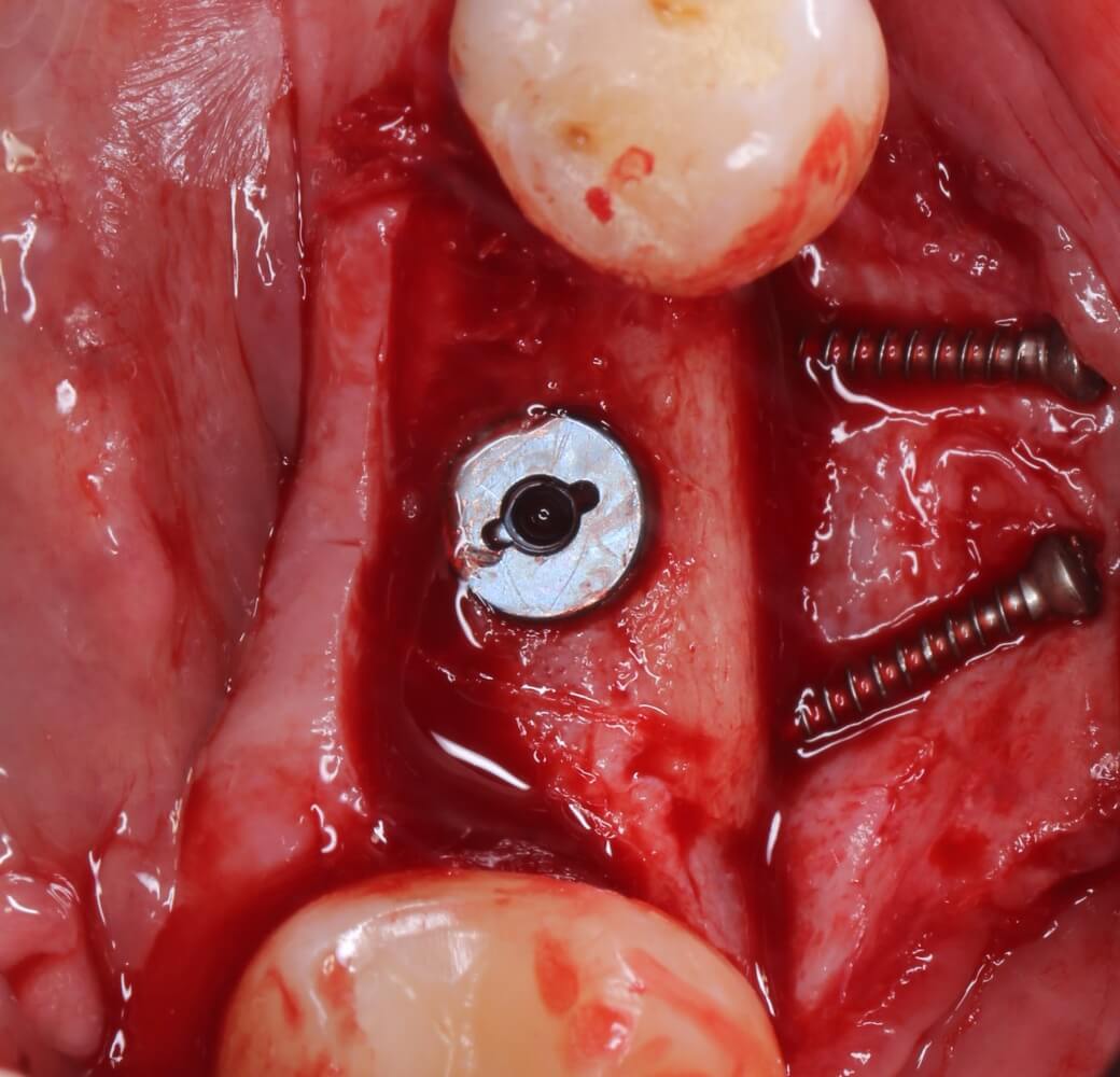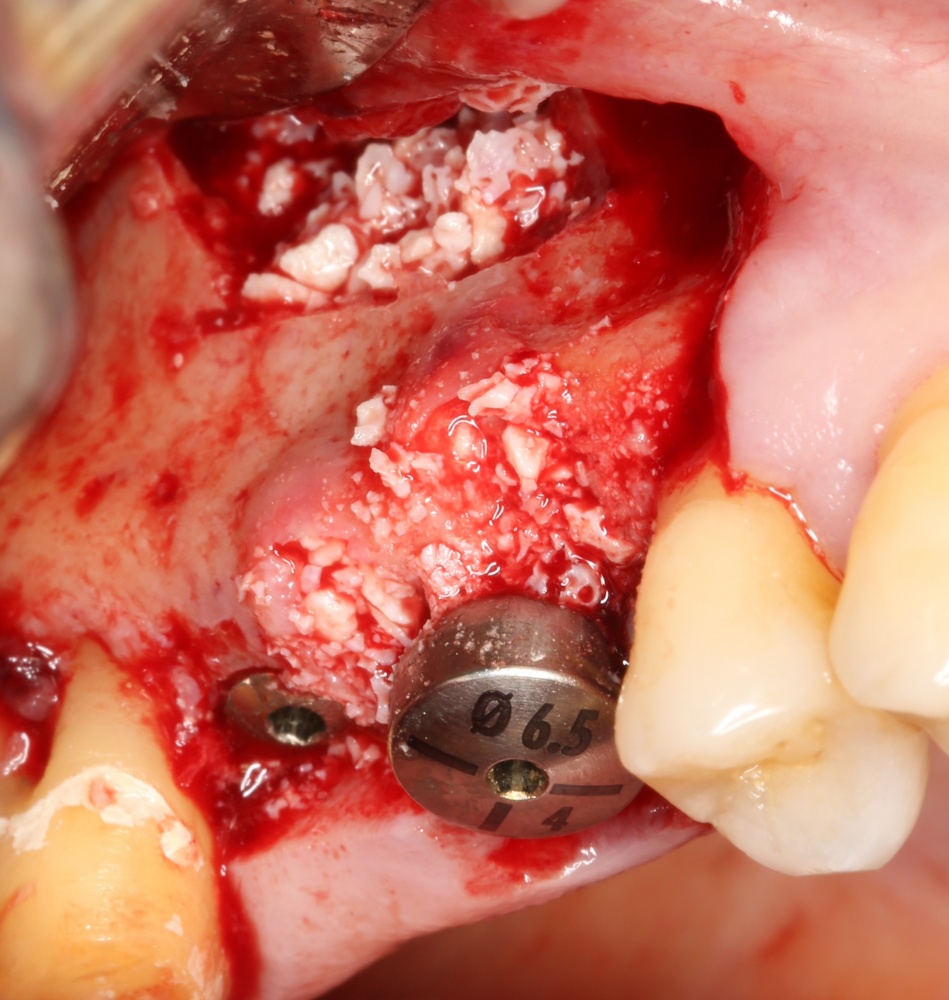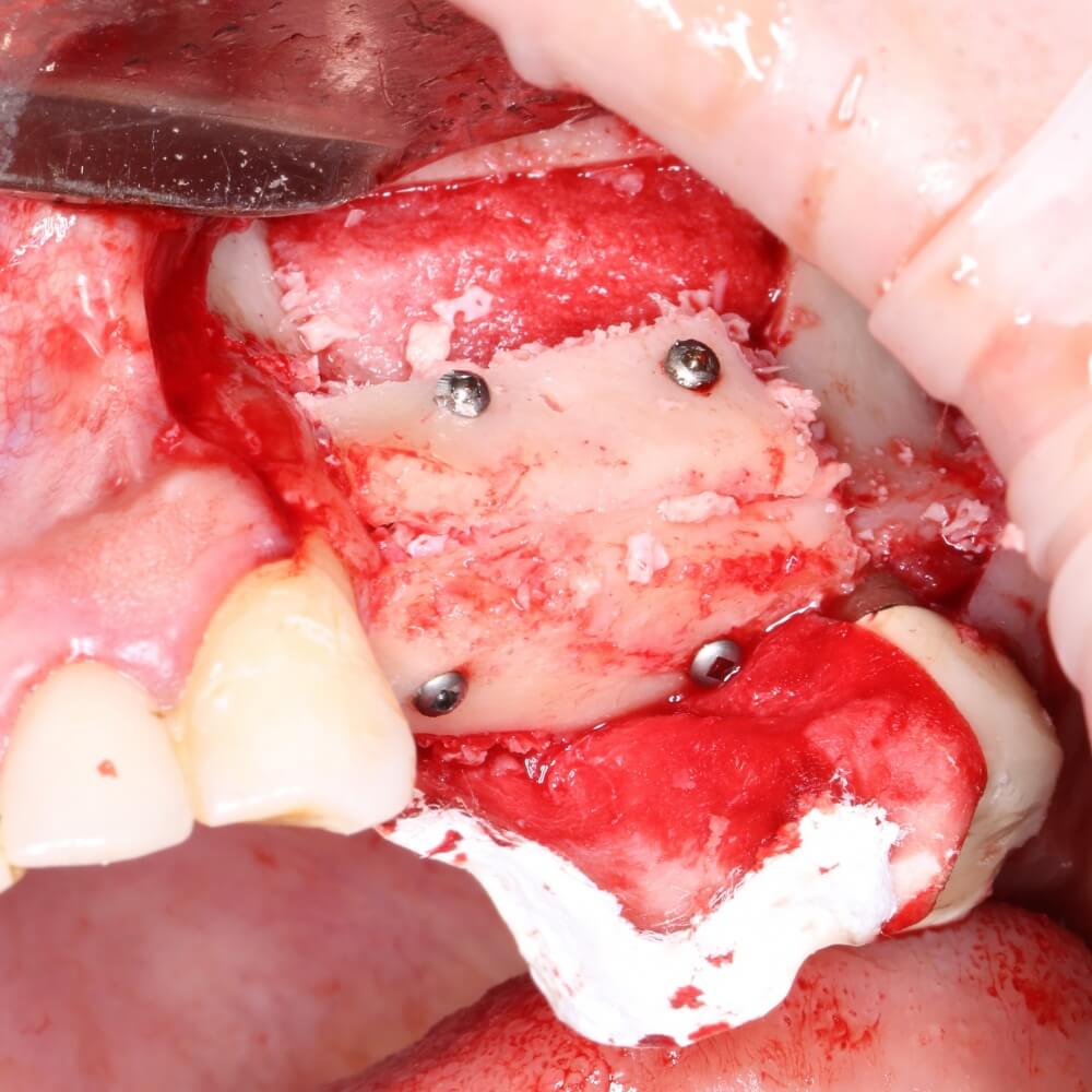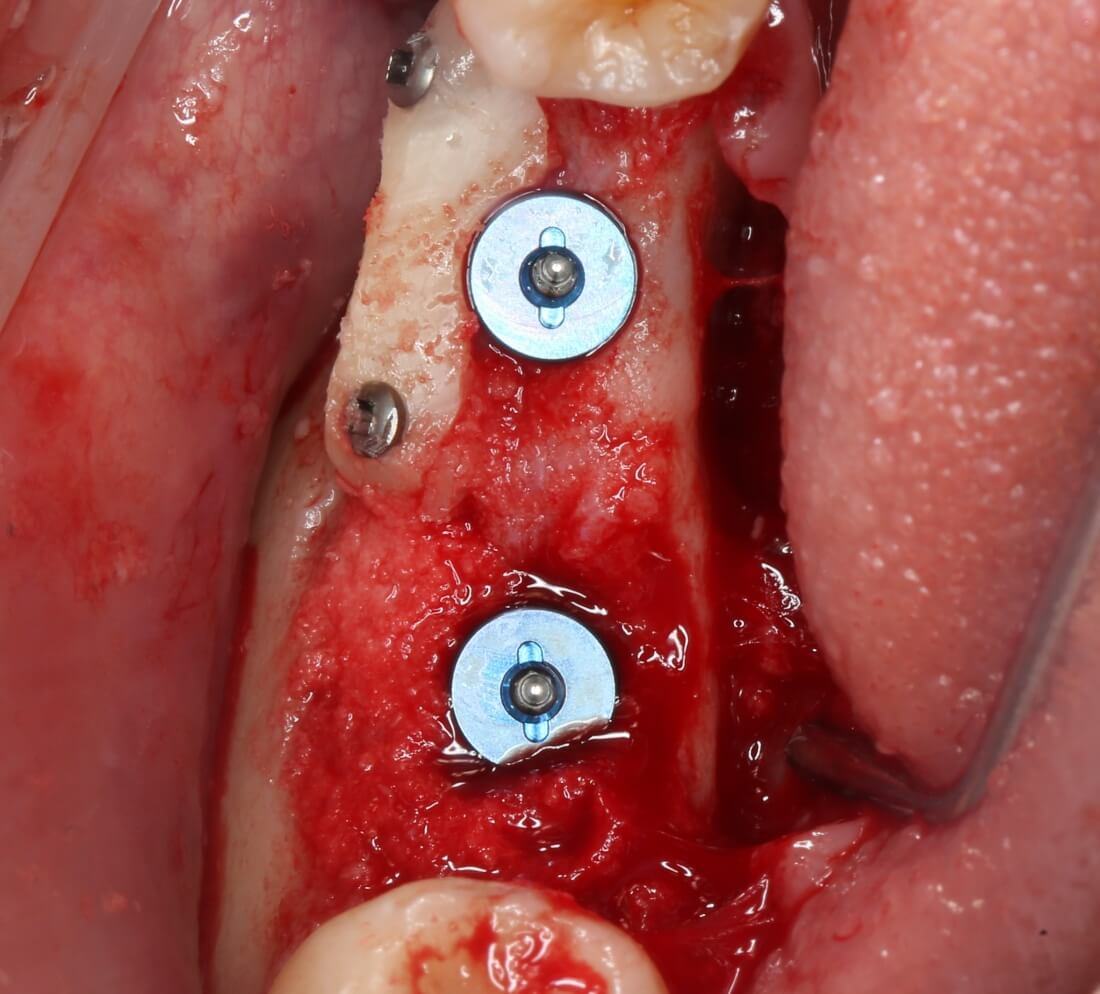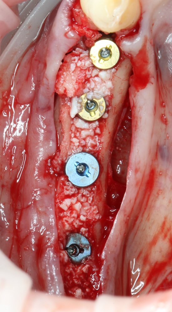 А вот направленная костная регенерация — это вариант. И по условиям, и по клинической ситуации. Правда, НКР получается примерно в полтора раза дороже и не улучшает стабильность имплантатов. Если бы у меня была ипотека и автокредит, а пациентка после операции находилась бы в зоне досягаемости, то этот метод остеопластики был бы оптимальным с точки зрения баланса сложность/травматичность/результат.