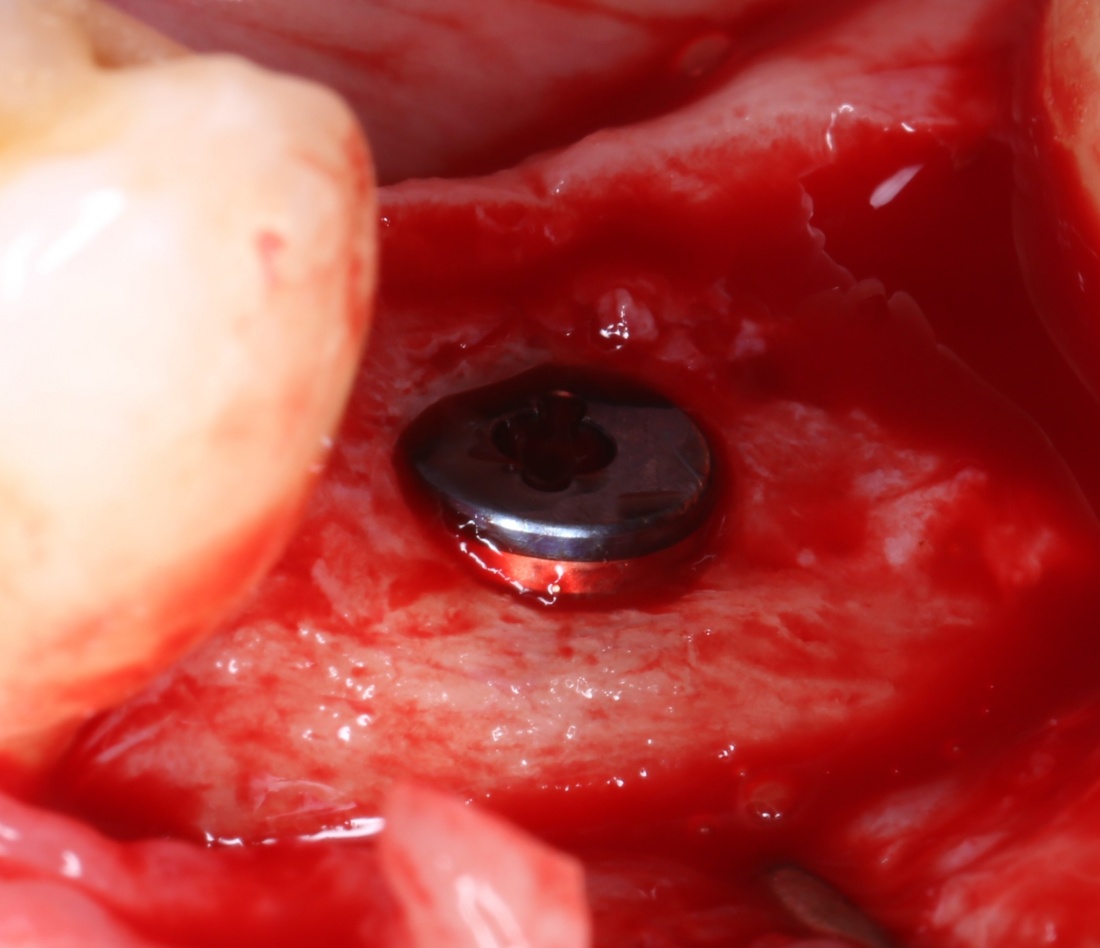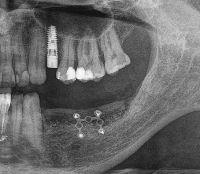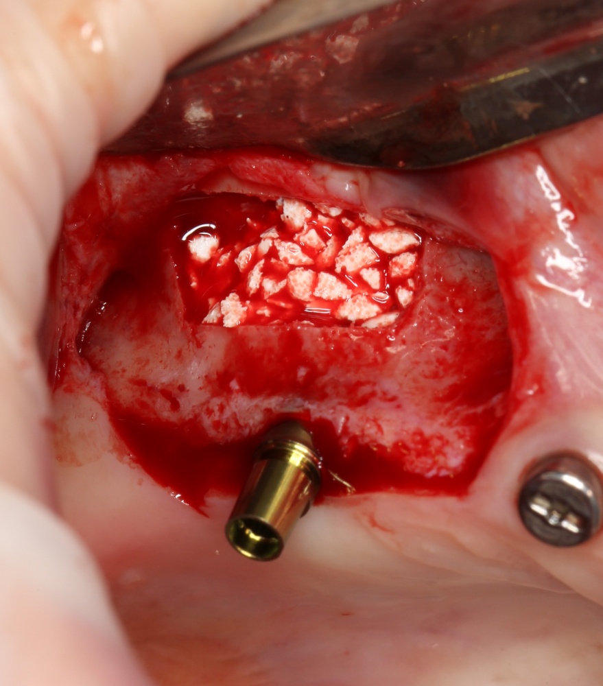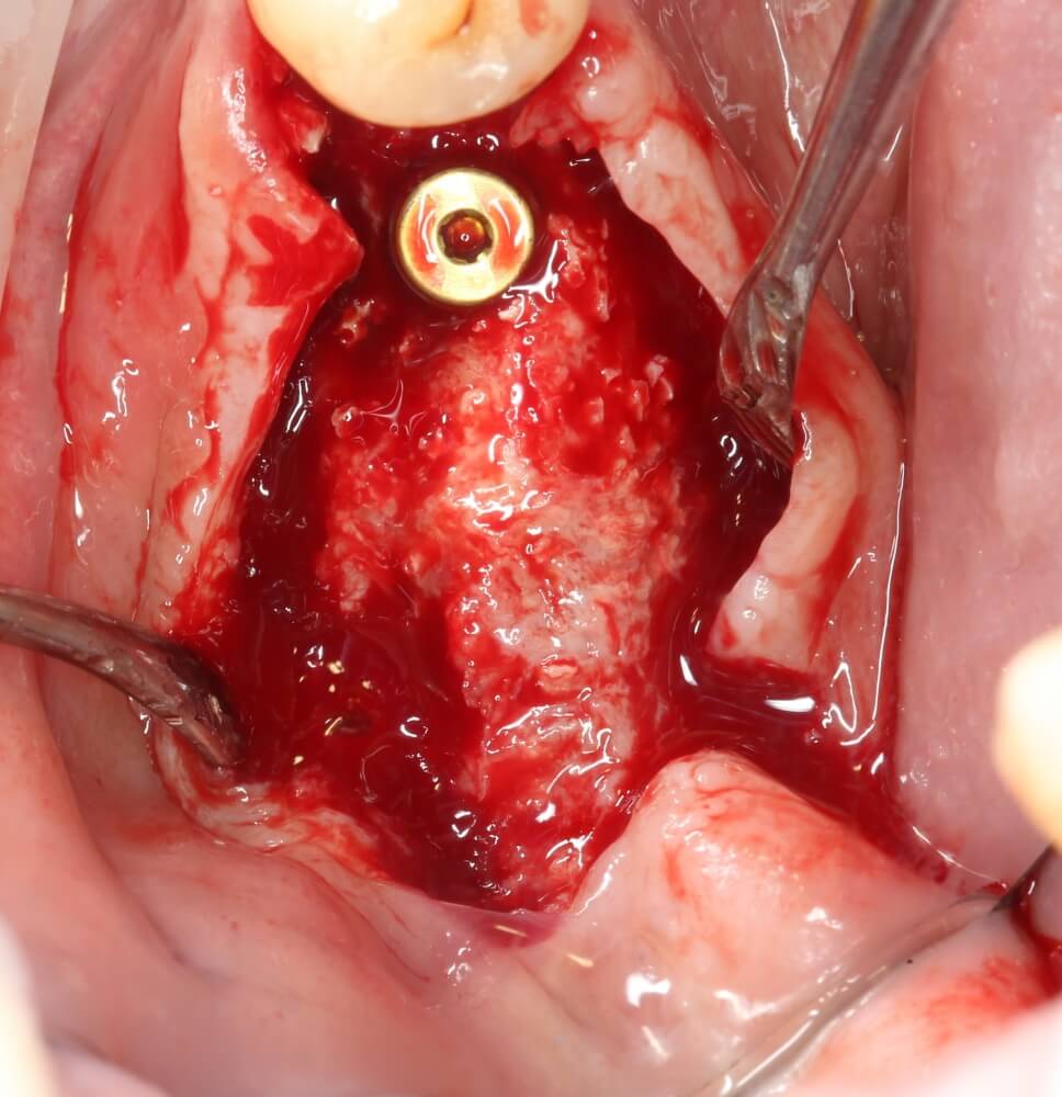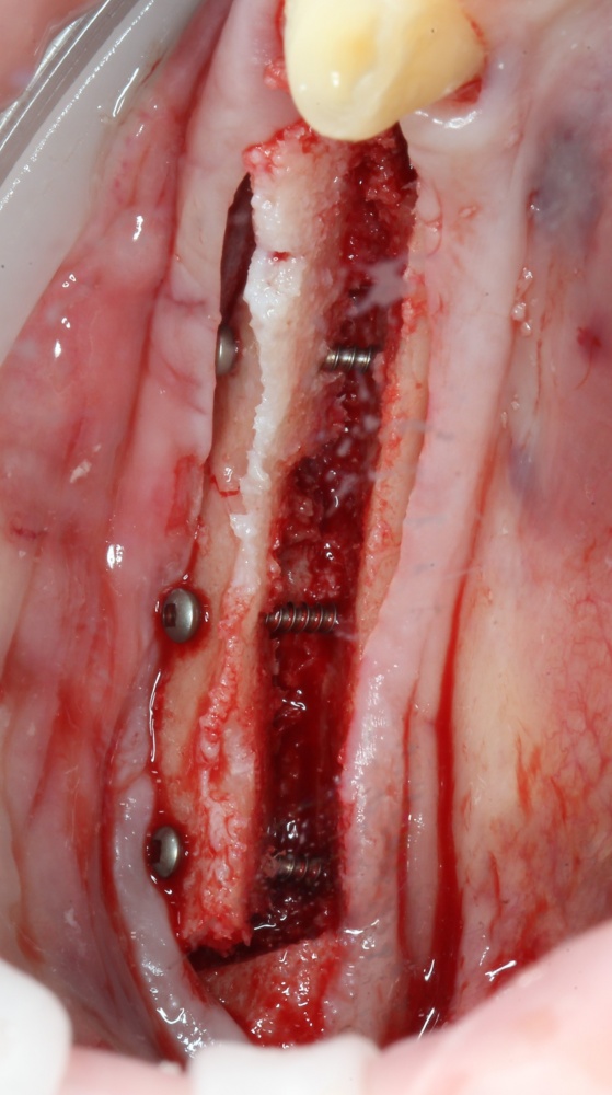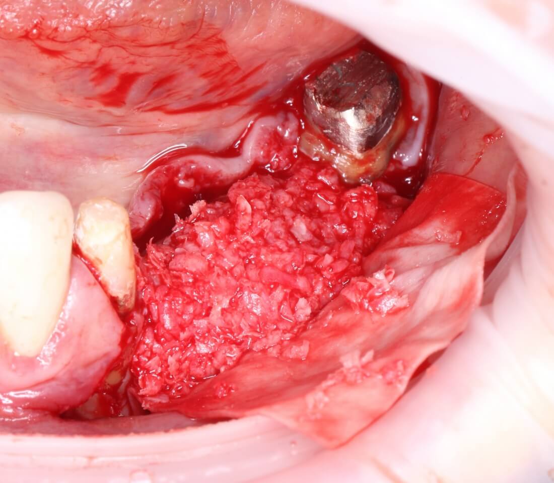 А вот направленная костная регенерация — это вариант. И по условиям, и по клинической ситуации. Правда, НКР получается примерно в полтора раза дороже и не улучшает стабильность имплантатов. Если бы у меня была ипотека и автокредит, а пациентка после операции находилась бы в зоне досягаемости, то этот метод остеопластики был бы оптимальным с точки зрения баланса сложность/травматичность/результат.