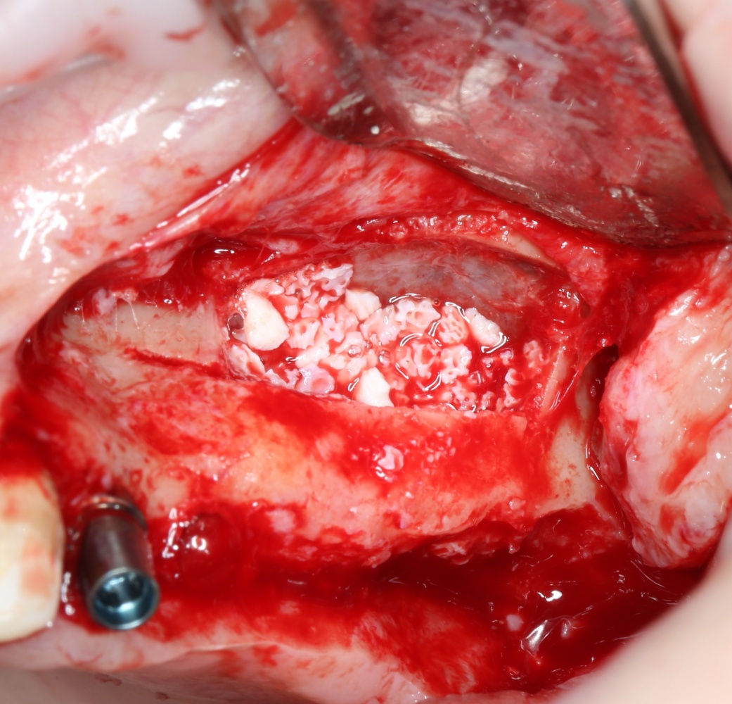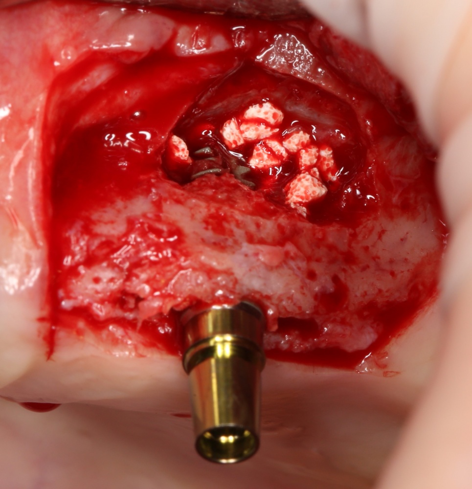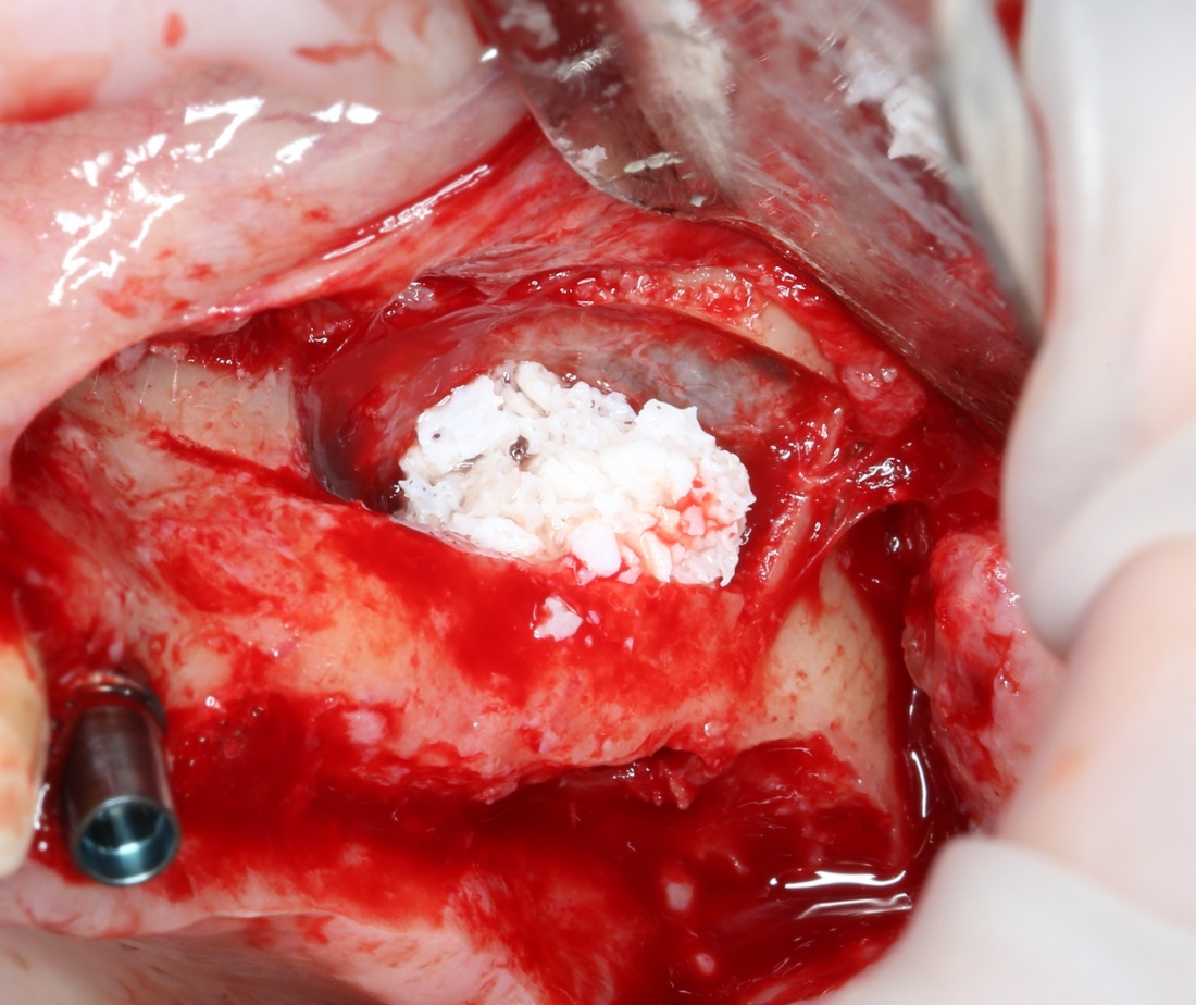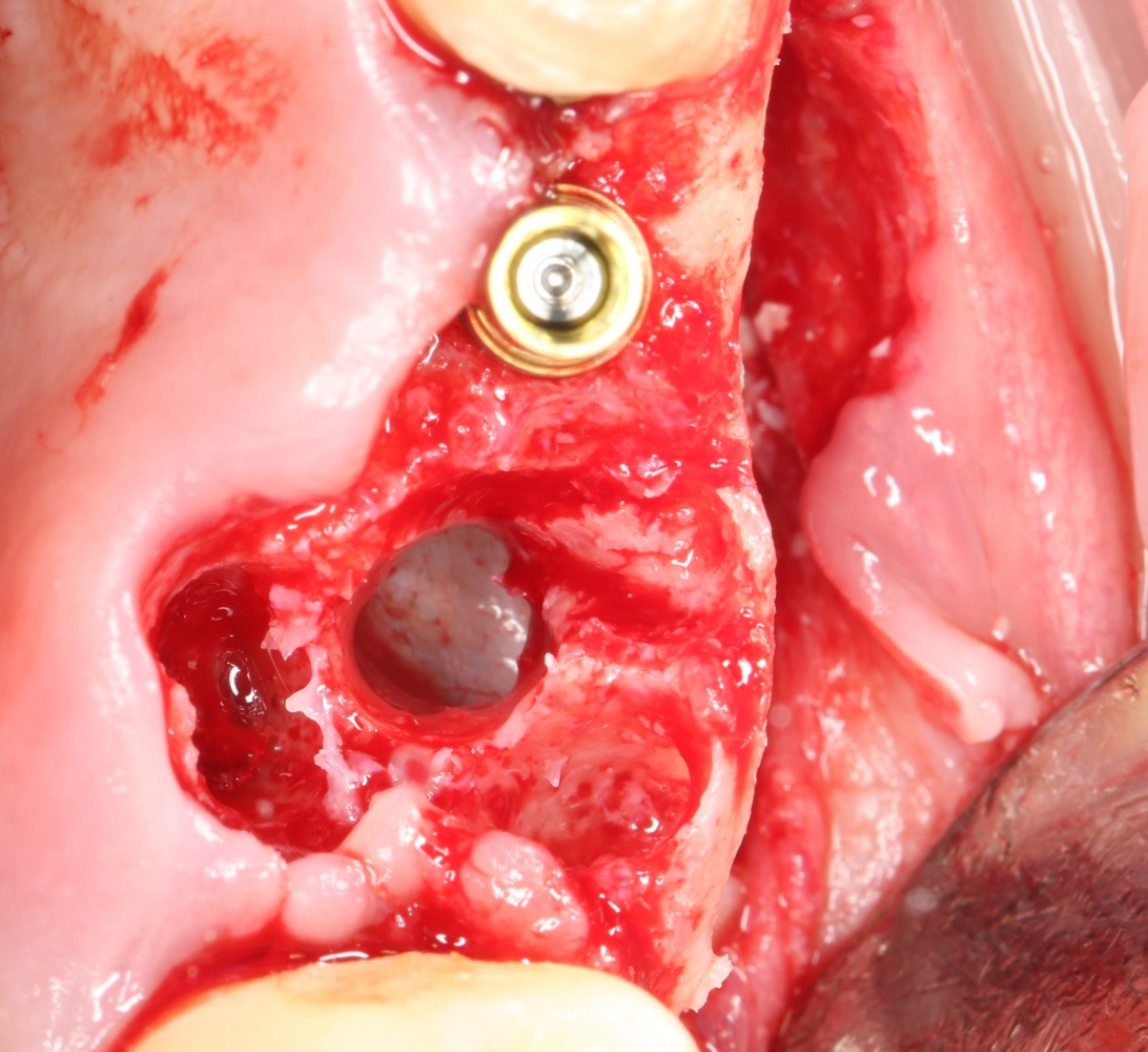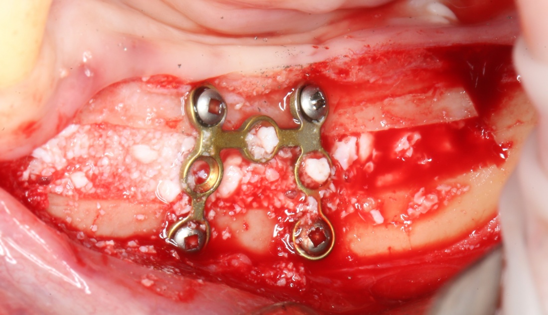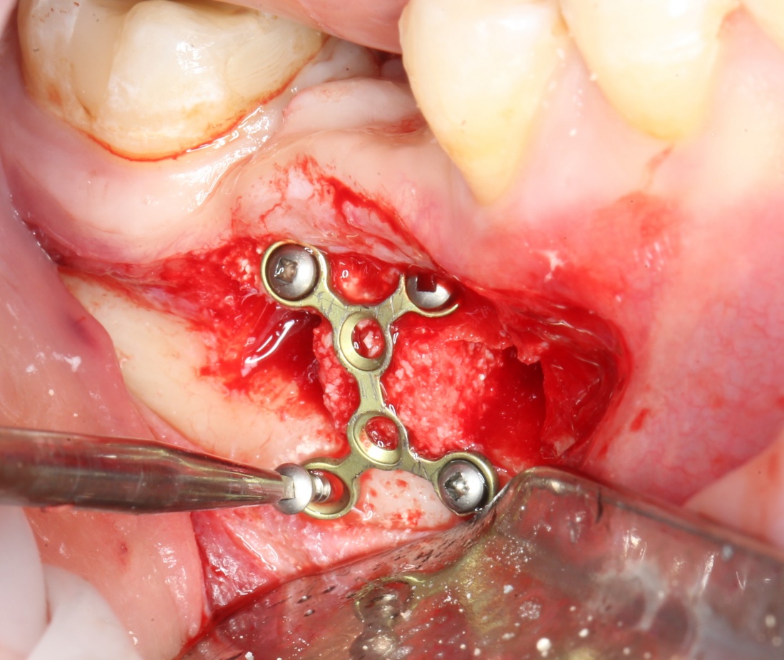 А вот направленная костная регенерация — это вариант. И по условиям, и по клинической ситуации. Правда, НКР получается примерно в полтора раза дороже и не улучшает стабильность имплантатов. Если бы у меня была ипотека и автокредит, а пациентка после операции находилась бы в зоне досягаемости, то этот метод остеопластики был бы оптимальным с точки зрения баланса сложность/травматичность/результат.