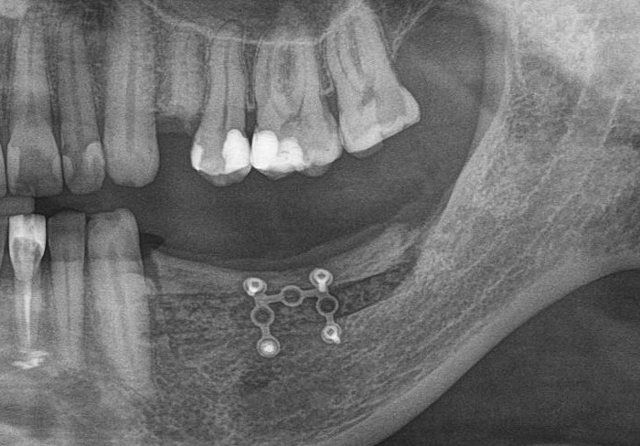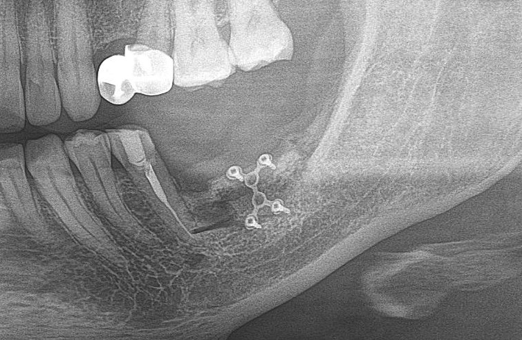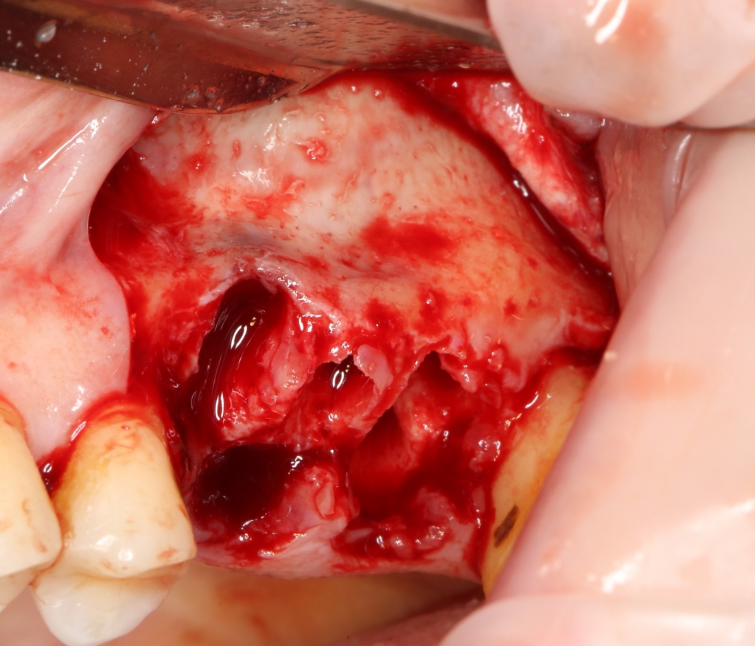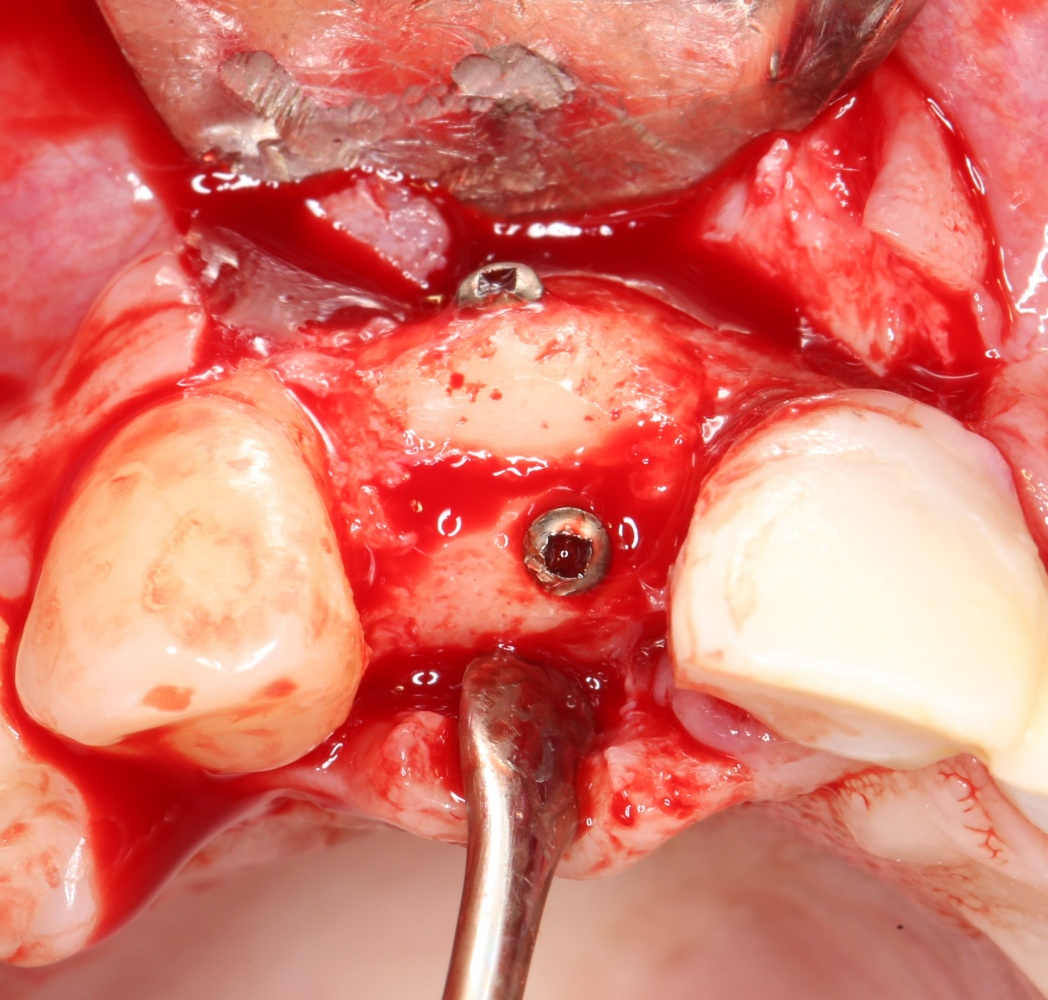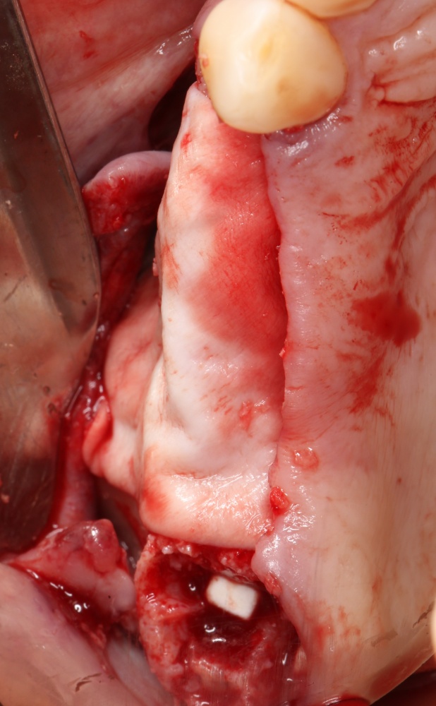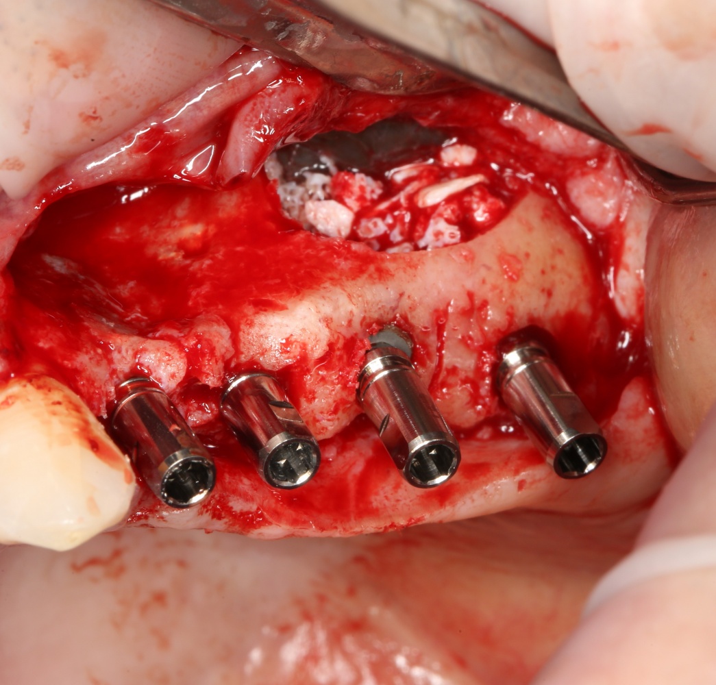 А вот направленная костная регенерация — это вариант. И по условиям, и по клинической ситуации. Правда, НКР получается примерно в полтора раза дороже и не улучшает стабильность имплантатов. Если бы у меня была ипотека и автокредит, а пациентка после операции находилась бы в зоне досягаемости, то этот метод остеопластики был бы оптимальным с точки зрения баланса сложность/травматичность/результат.