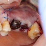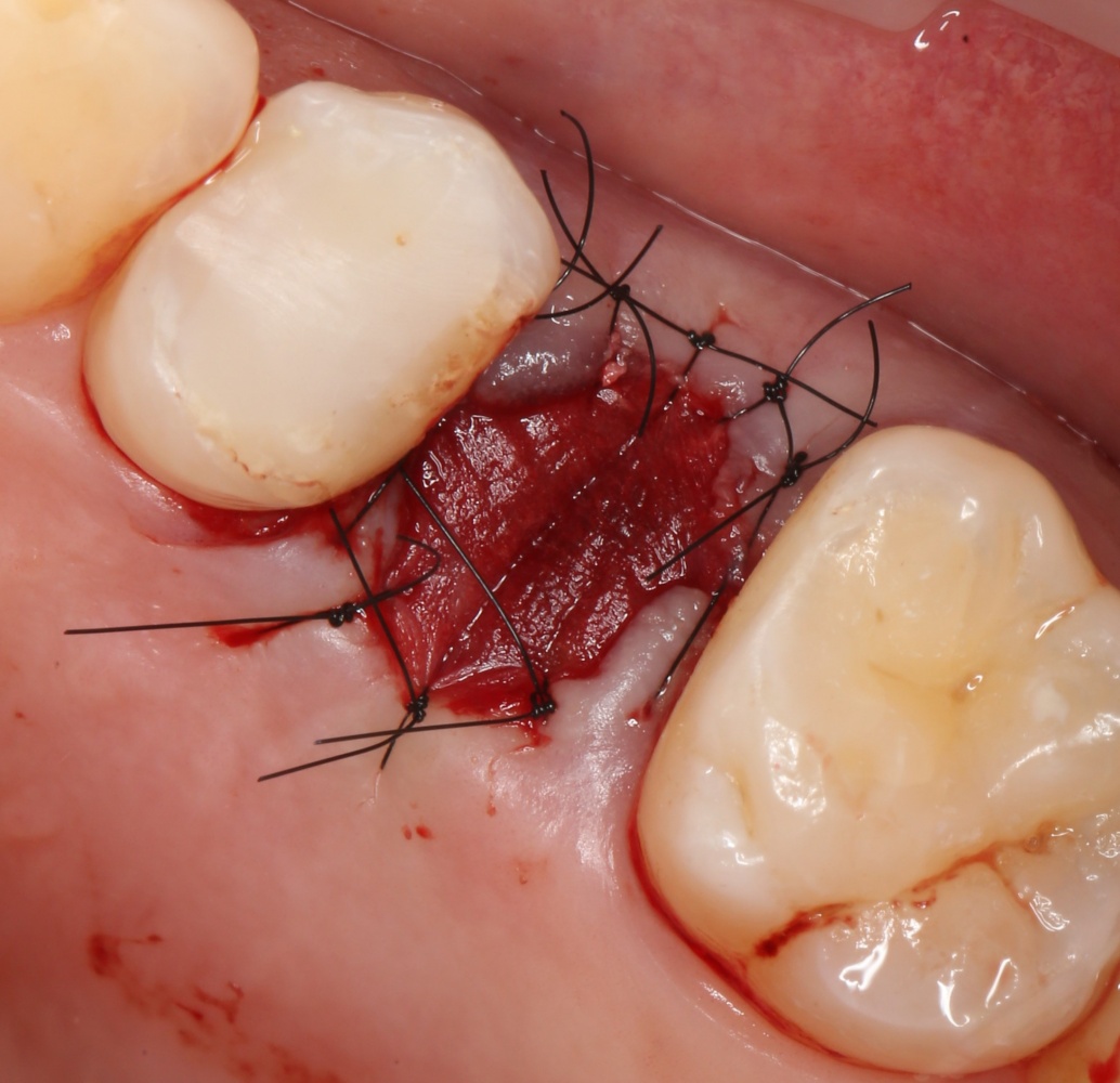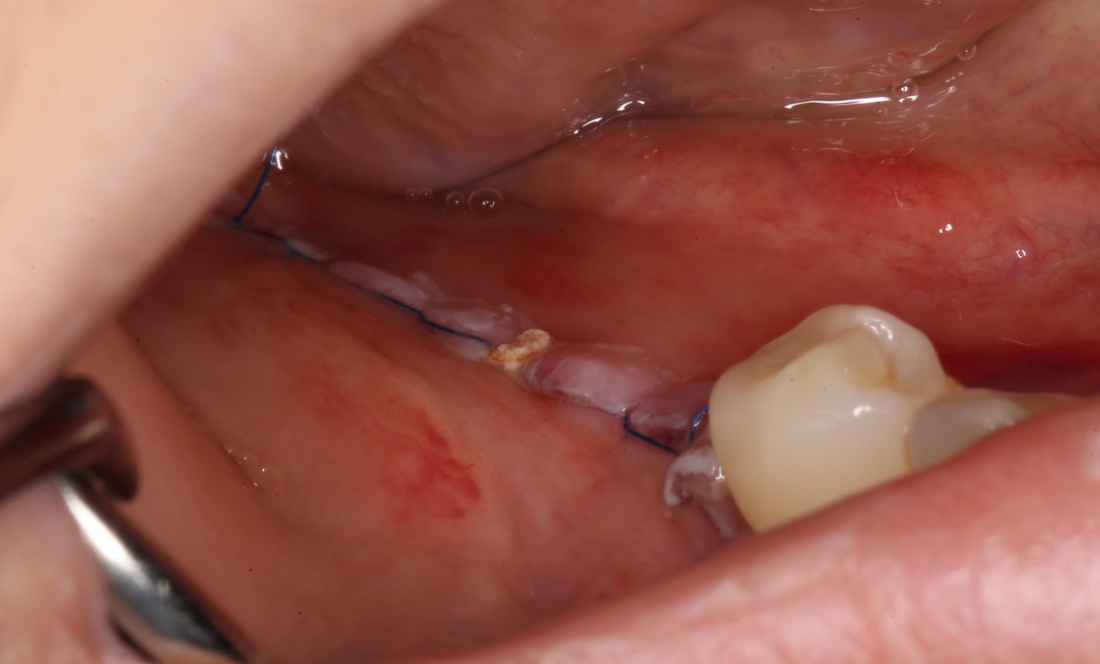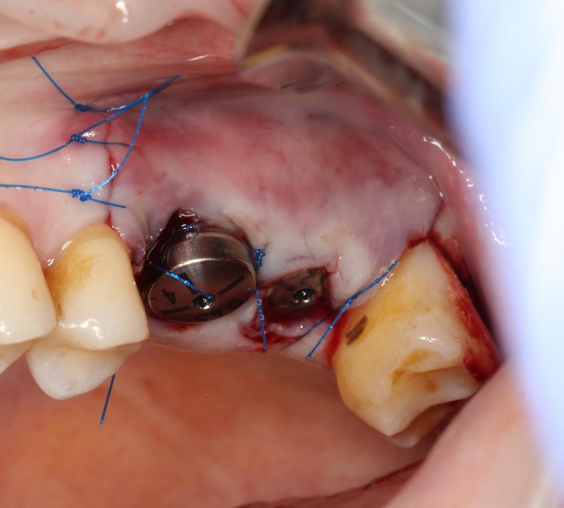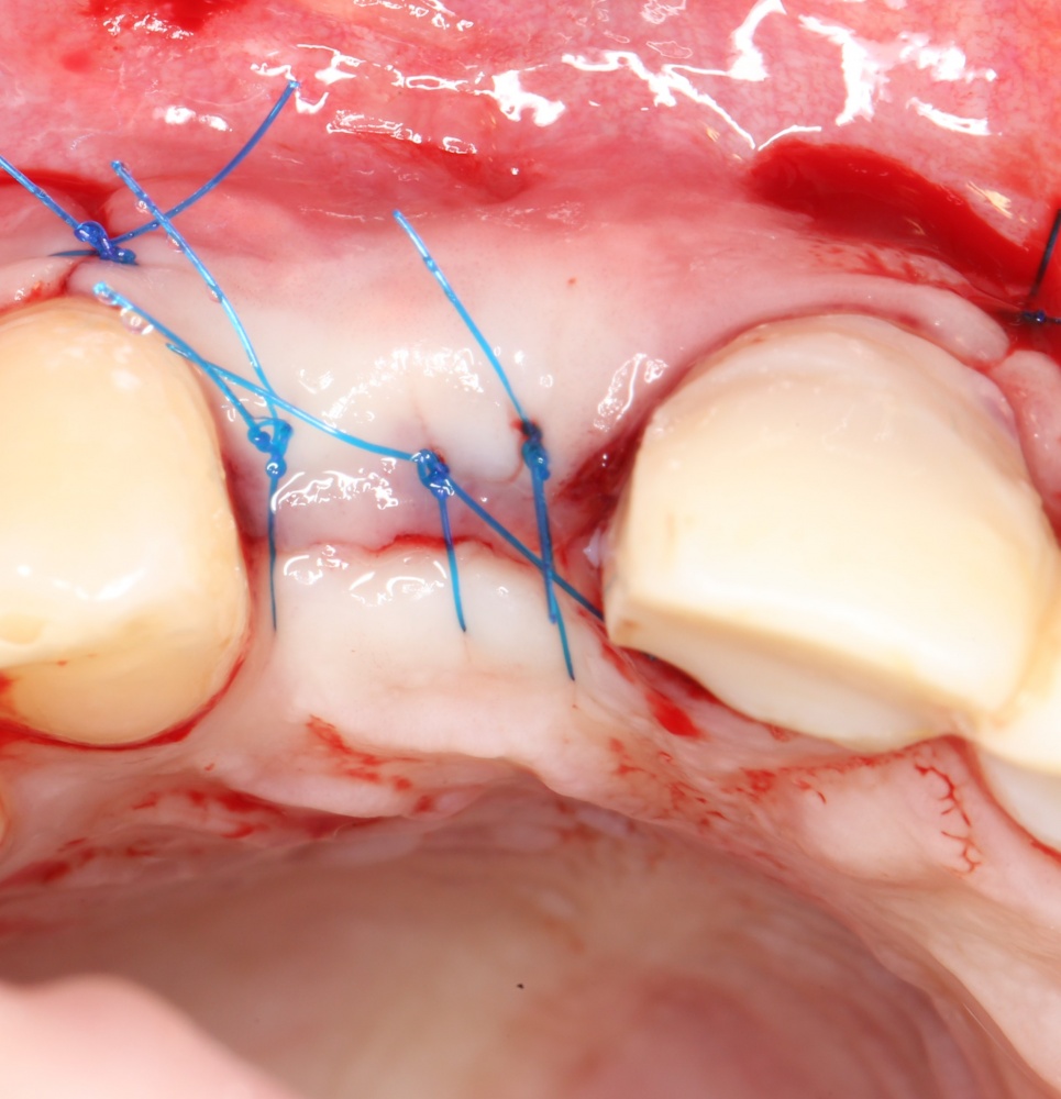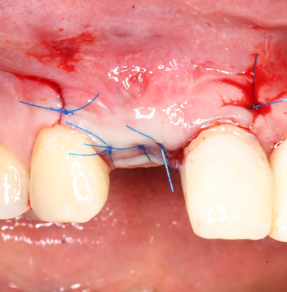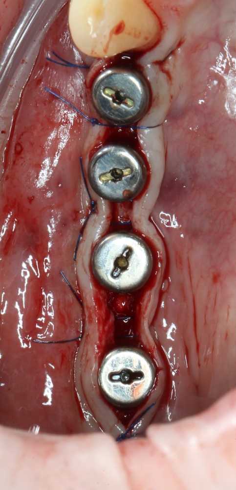 После я внимательно проверил, что костный блок и имплантаты полностью перекрыты. Теперь рану можно ушивать.