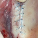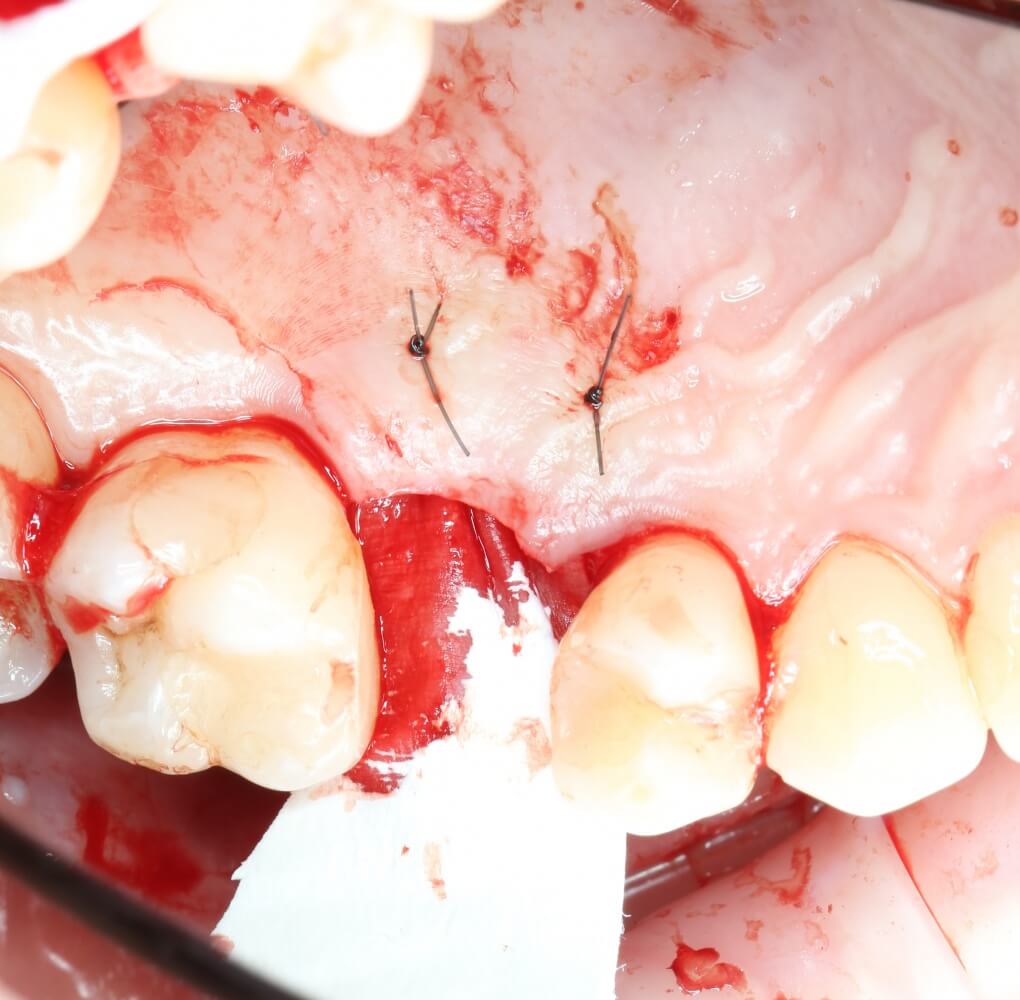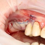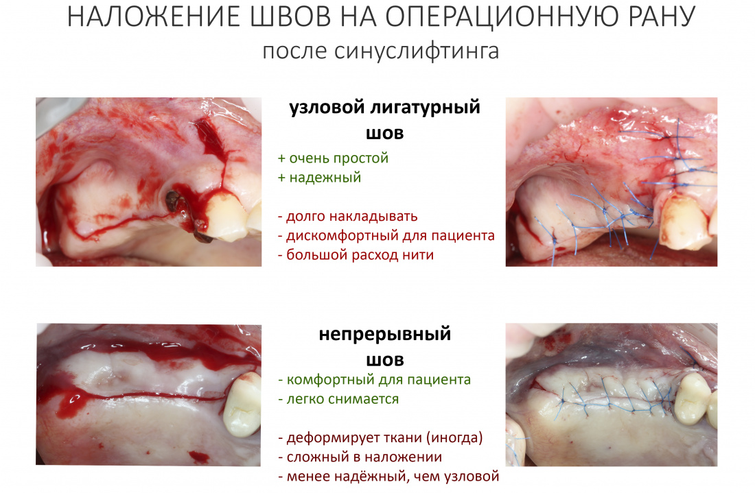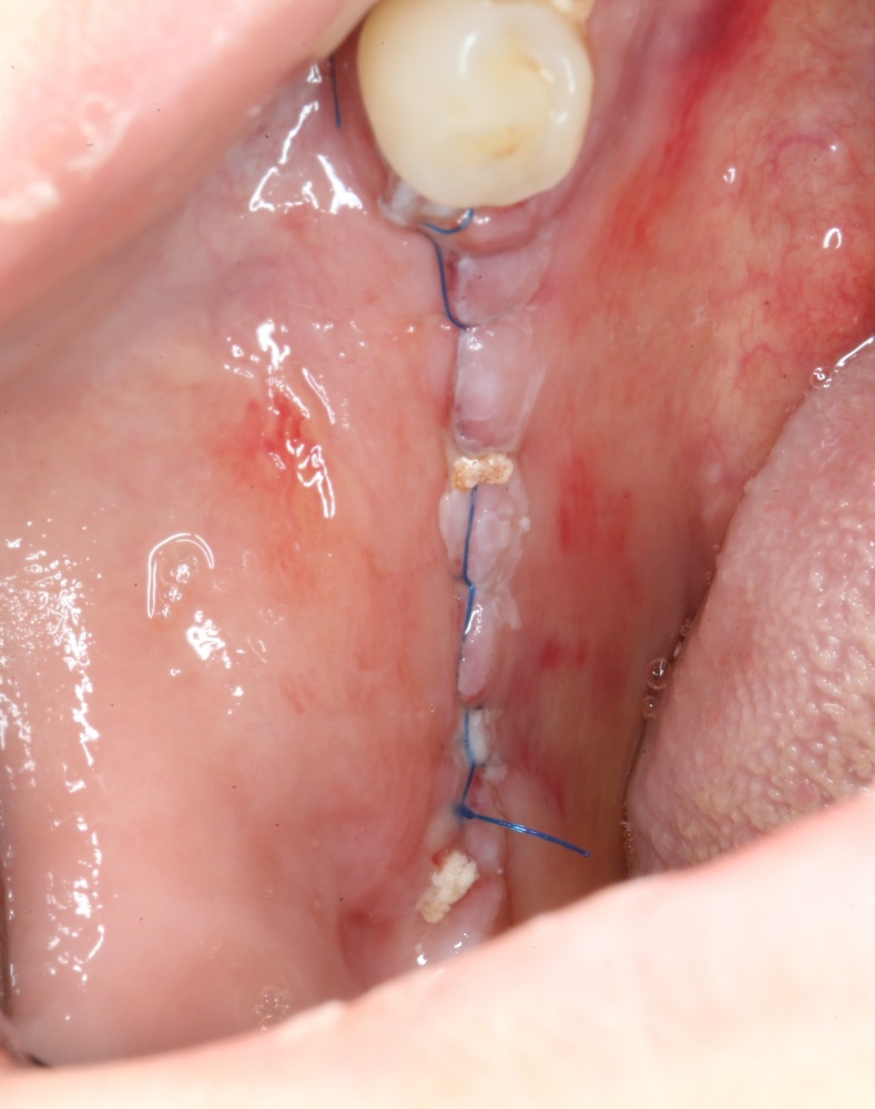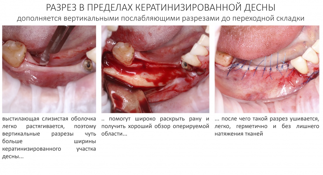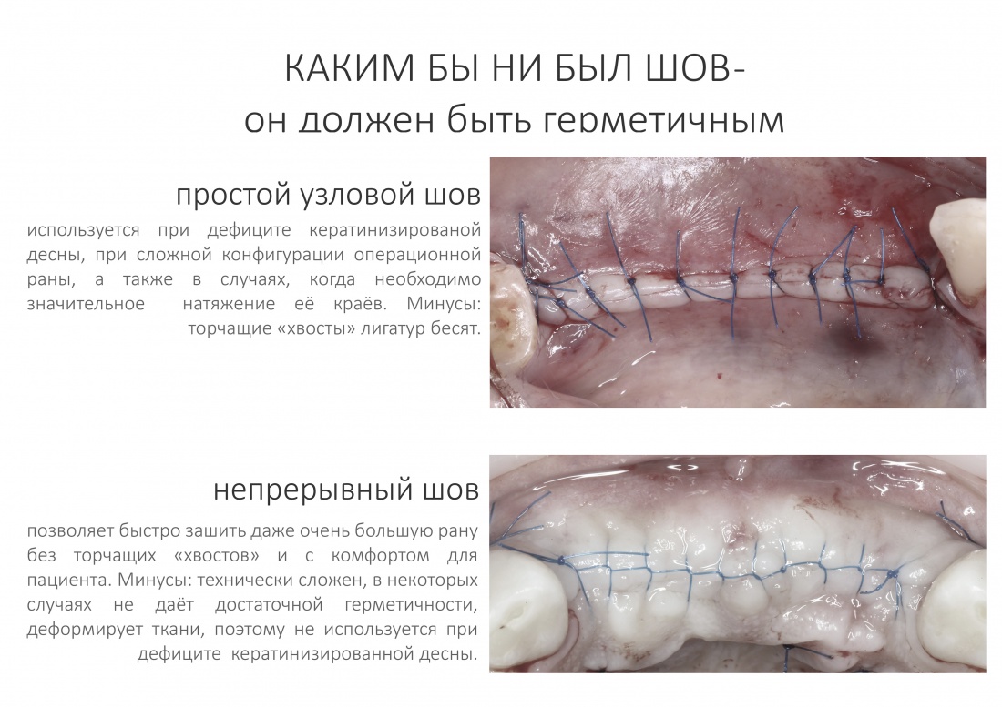 Если на этапе разреза и формирования раны всё сделано правильно, то наложение швов не вызывает особых трудностей. Периостотомия или послабляющие разрезы на периосте не требуются (ни практически никогда не требуются). А сами швы получаются аккуратными и герметичными: