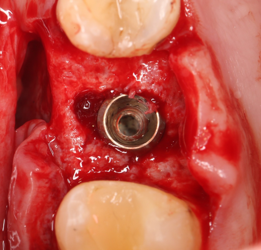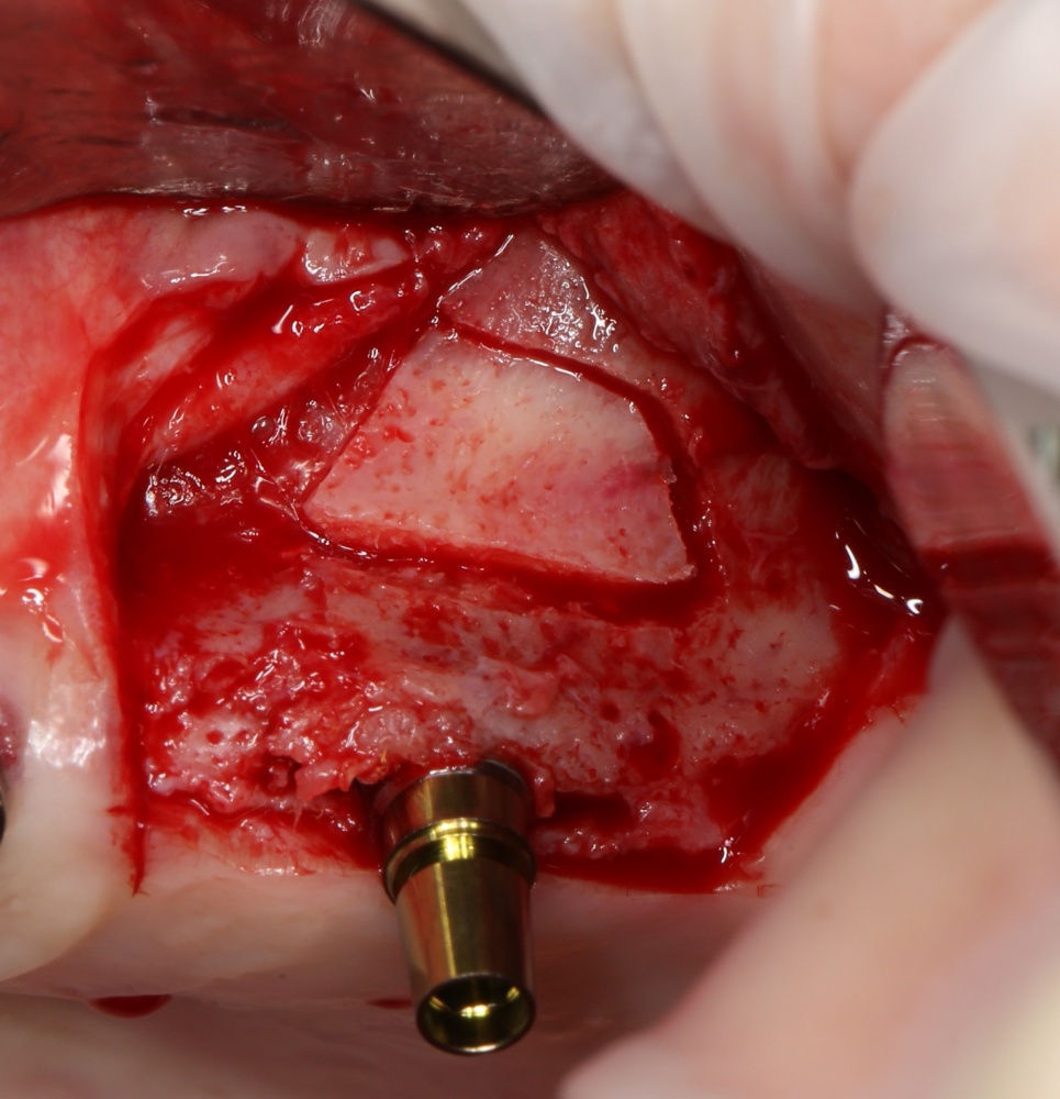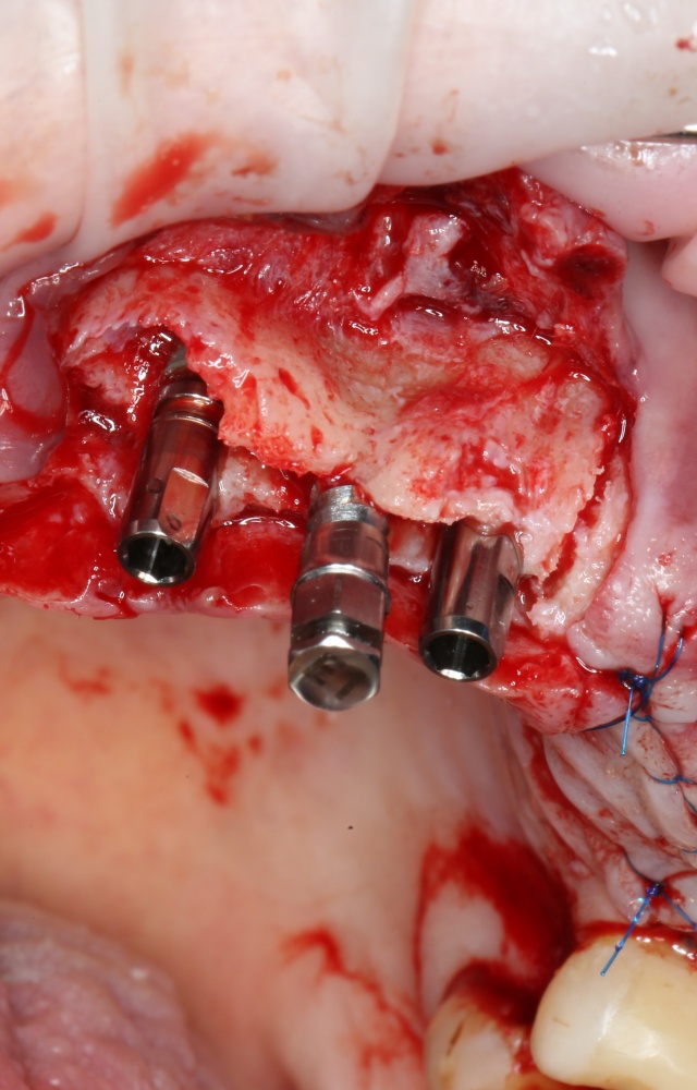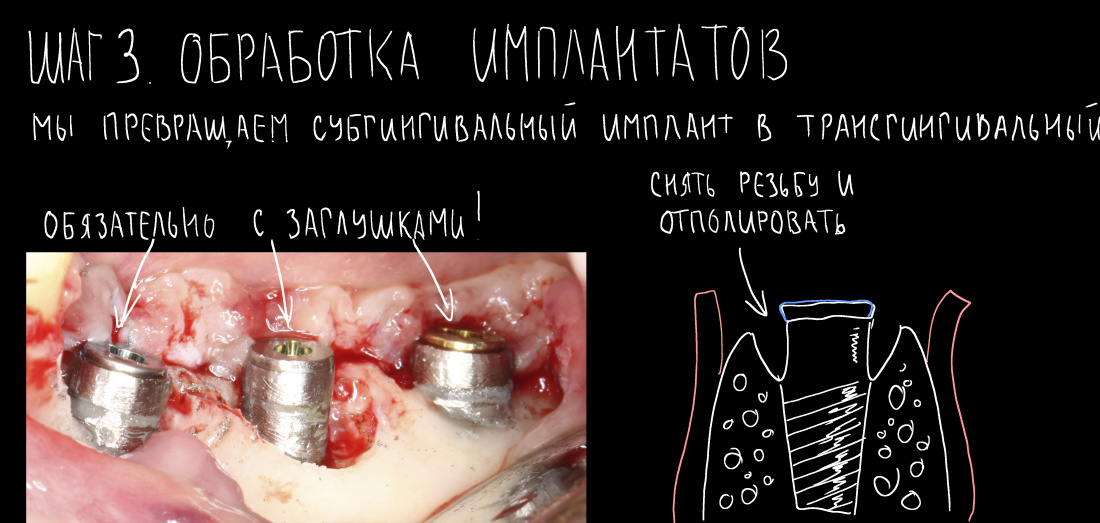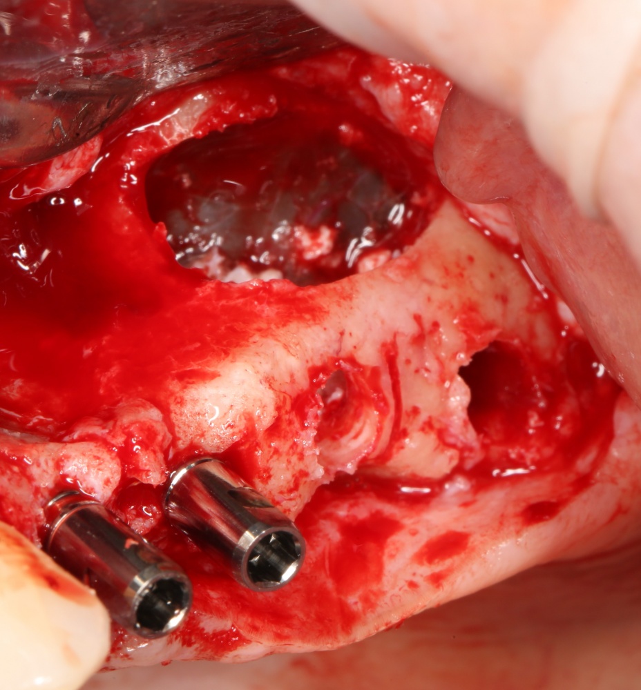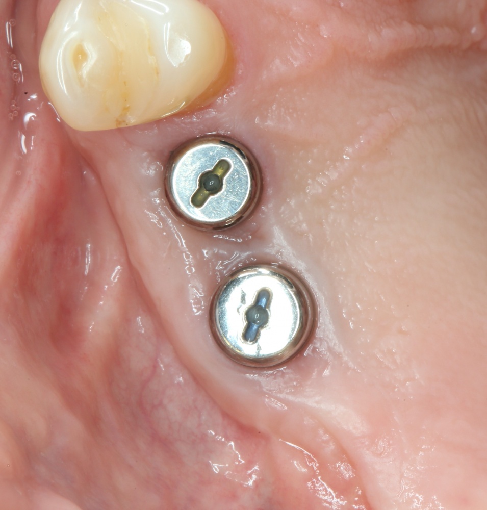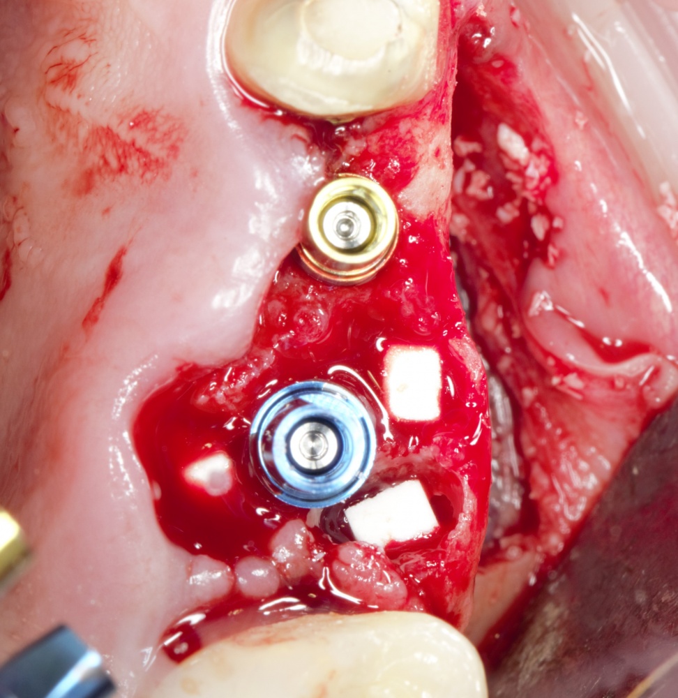 Безусловно, субгингивальные имплантаты удобнее во всех отношениях, но… после остеопластики сложно спрогнозировать уровень атрофии кости в послеоперационном участке и угадать с правильным положением платформы. К тому моменту у меня уже был опыт подобных операций, в т. ч. с субгингивальными имплантатами, но не при такой конфигурации альвеолярного гребня и не при таком объемном костном дефекте.