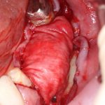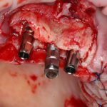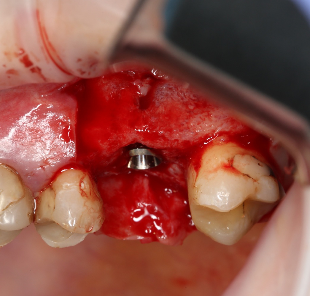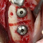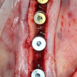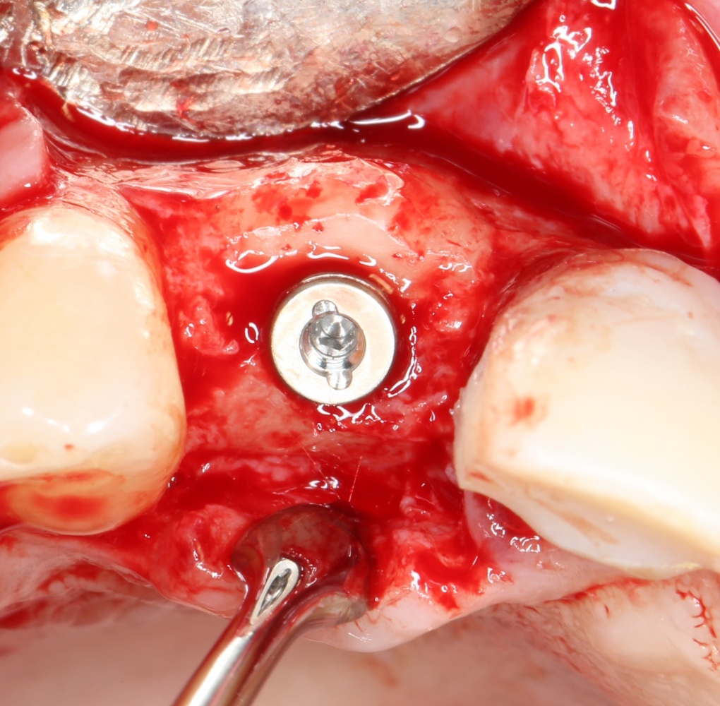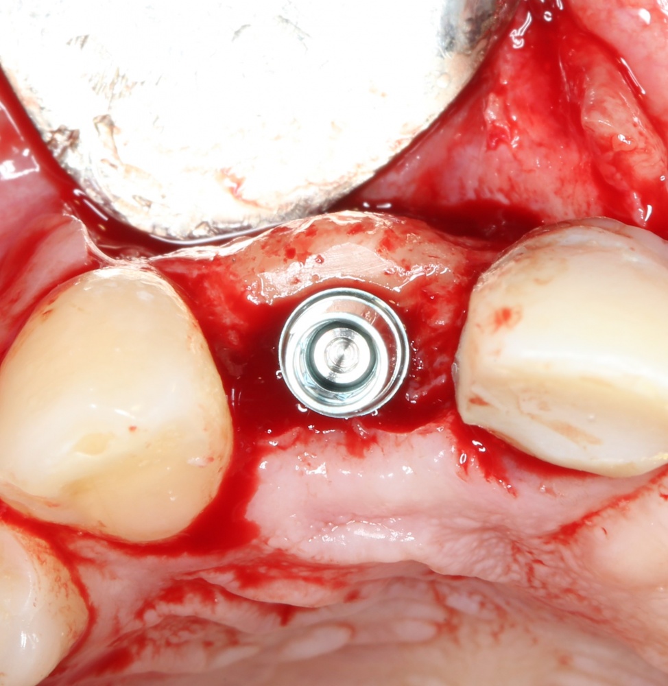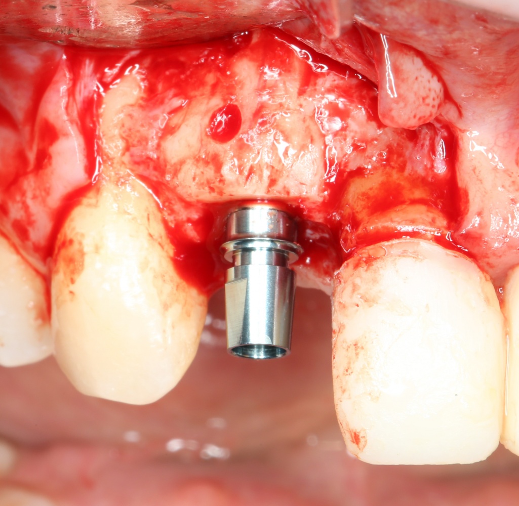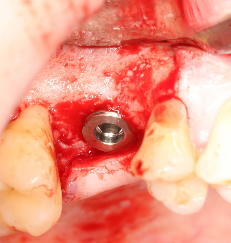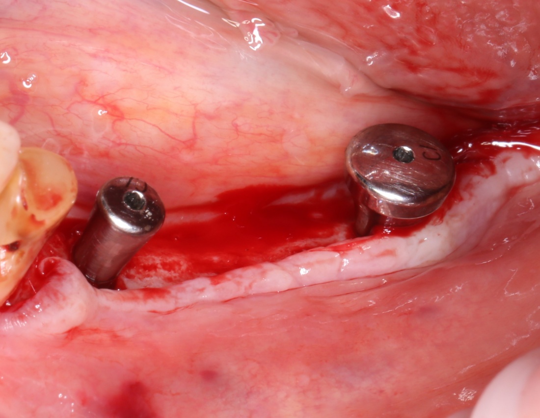 Безусловно, субгингивальные имплантаты удобнее во всех отношениях, но… после остеопластики сложно спрогнозировать уровень атрофии кости в послеоперационном участке и угадать с правильным положением платформы. К тому моменту у меня уже был опыт подобных операций, в т. ч. с субгингивальными имплантатами, но не при такой конфигурации альвеолярного гребня и не при таком объемном костном дефекте.
