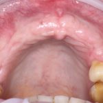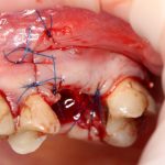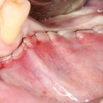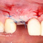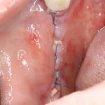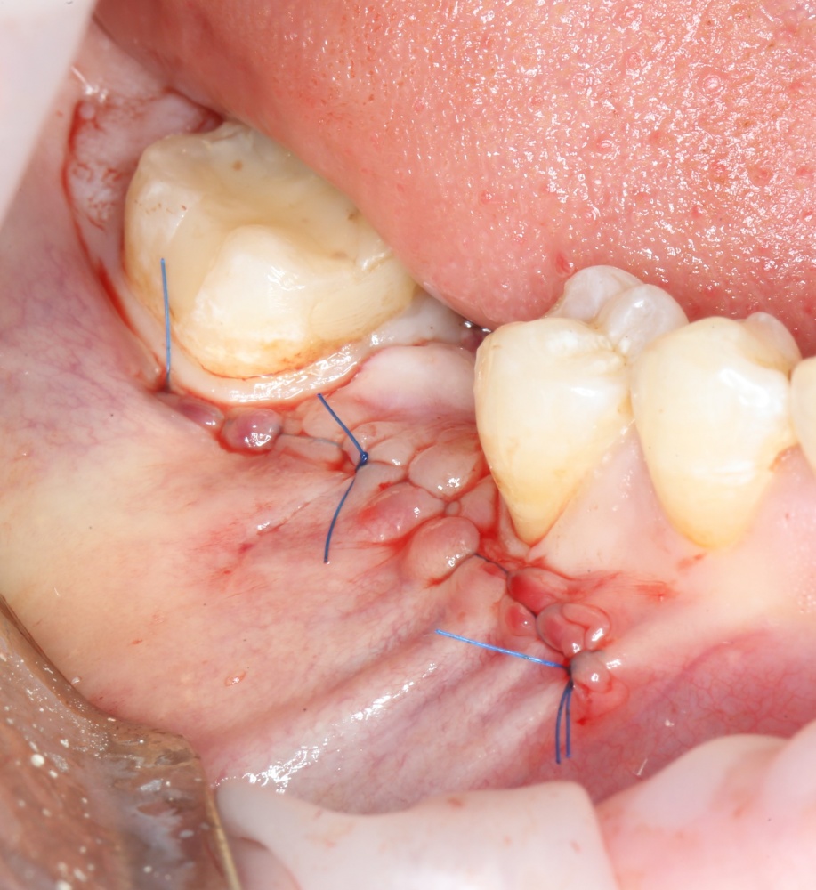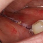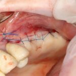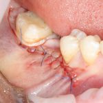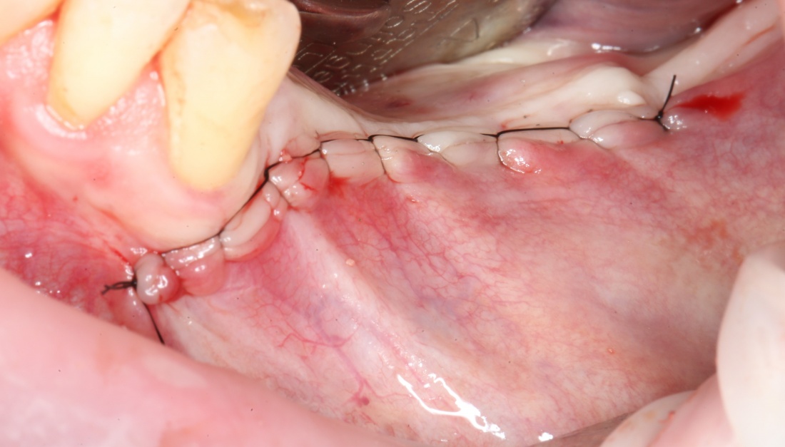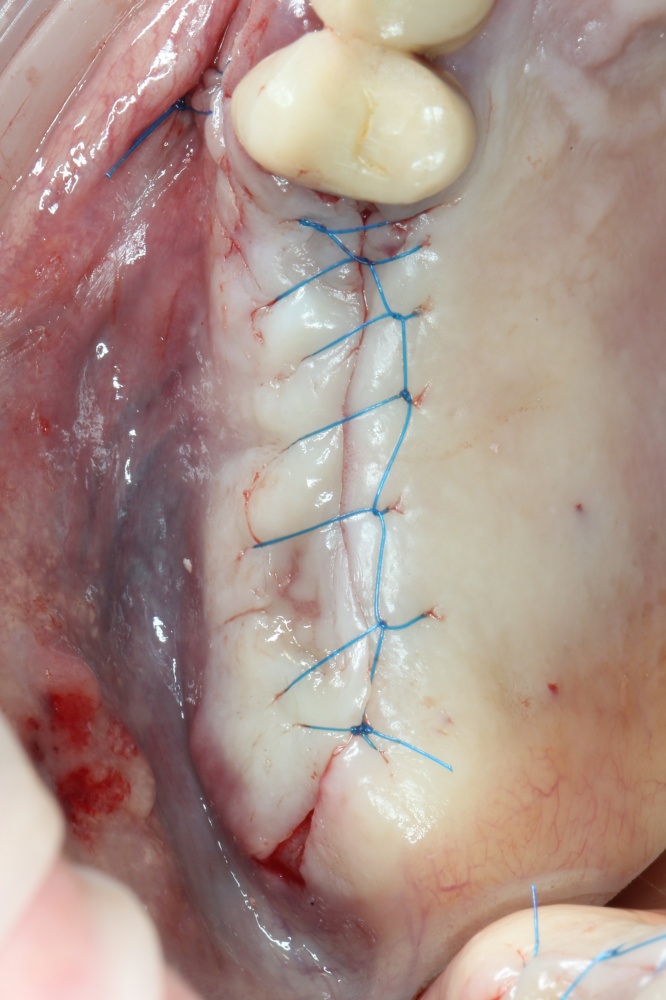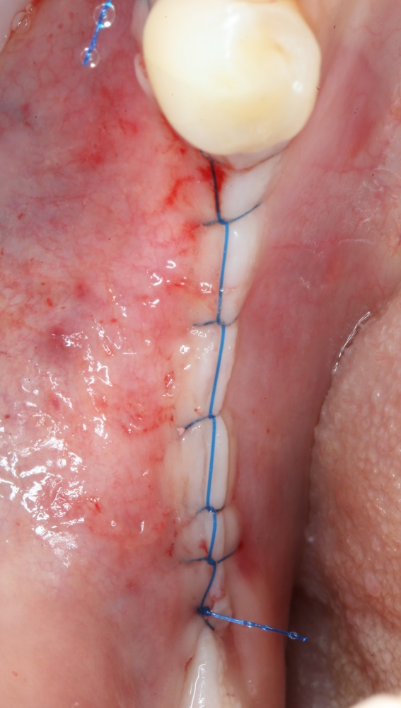 Обрати внимание, что все шовные лигатуры находятся в пределах кератинизированной десны. Это позволяет избежать деформации тканей и лишних рубцов. В наиболее уязвимых местах (около зубов) шовные лигатуры лучше продублировать.