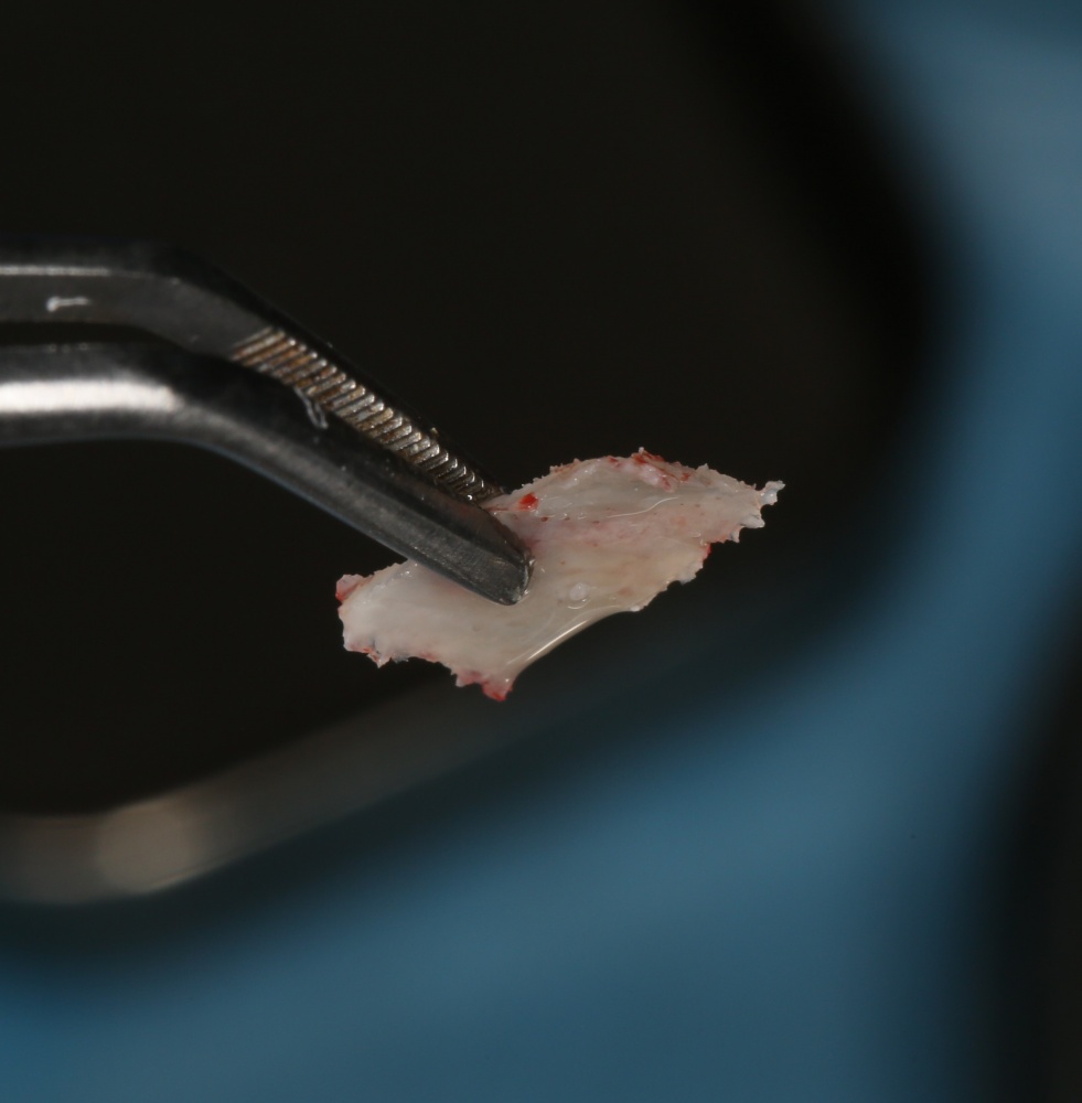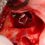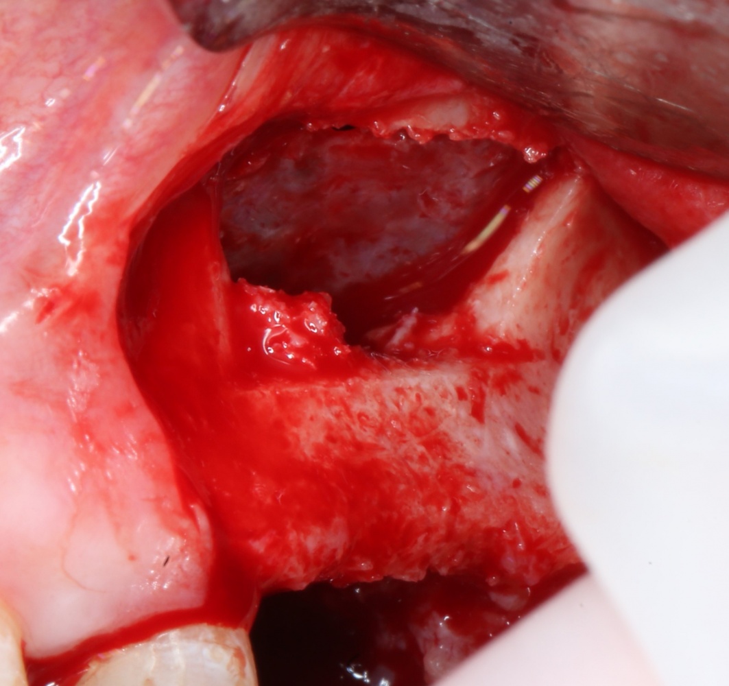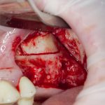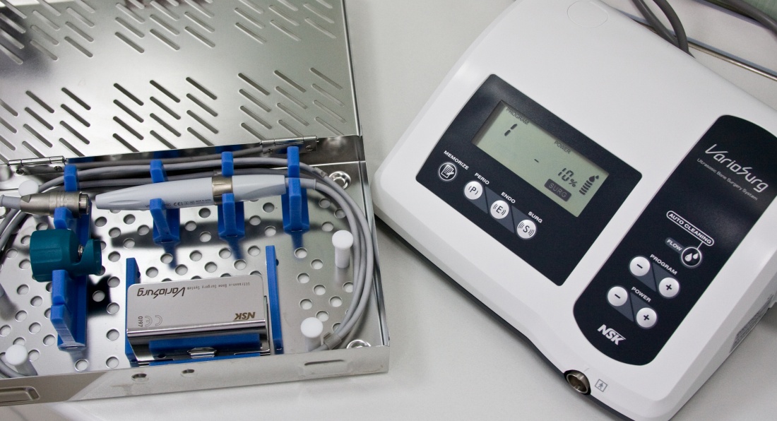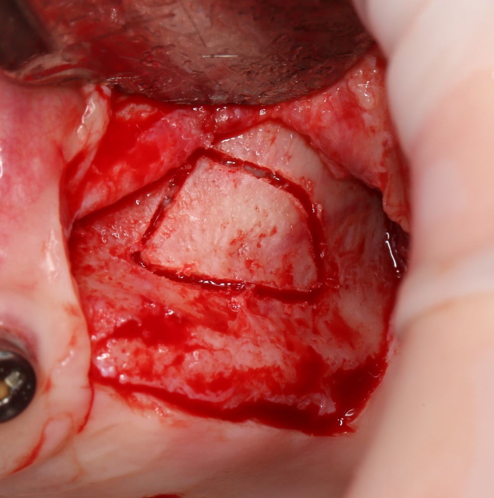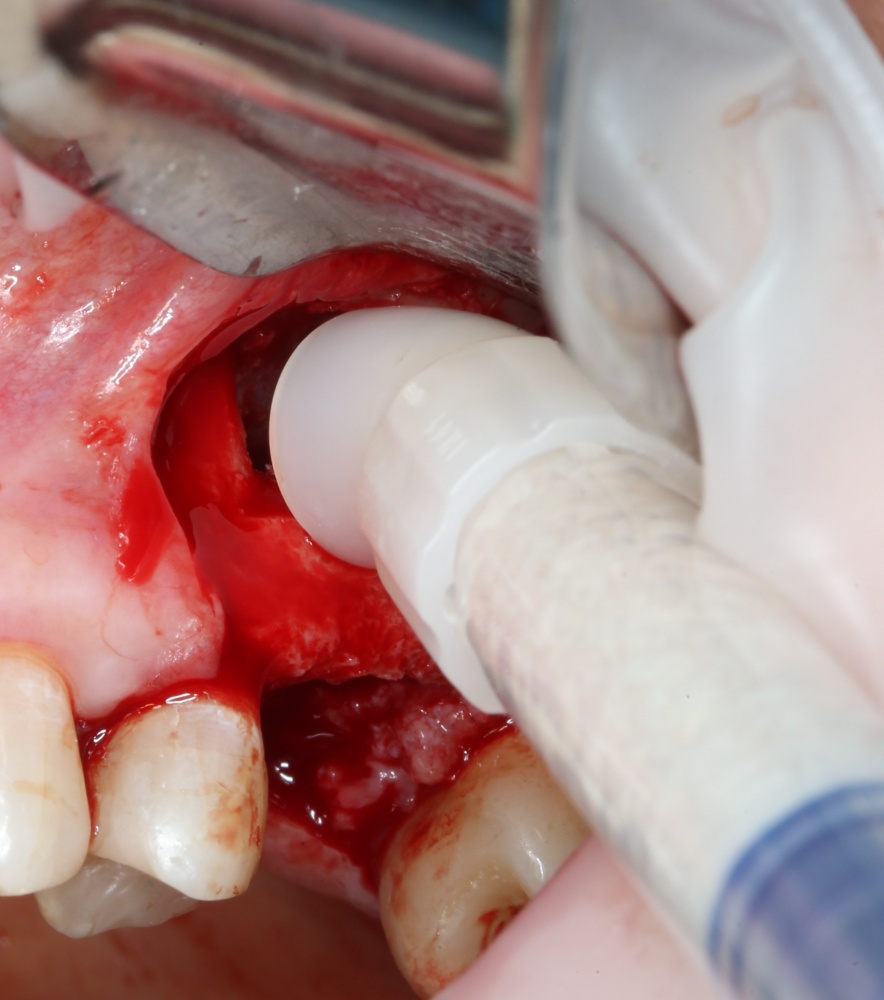 Для получения костного блока мы использовали ультразвуковую пьезохирургическую систему. Это самый удобный и безопасный инструмент для проведения подобных манипуляций. С помощью него мы сформировали и выделили костный блок. Он должен отделяться легким движением остеотома или элеватора. Как это сделать правильно — читай здесь>>