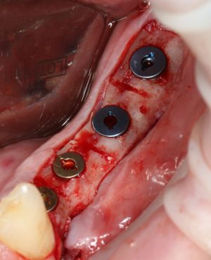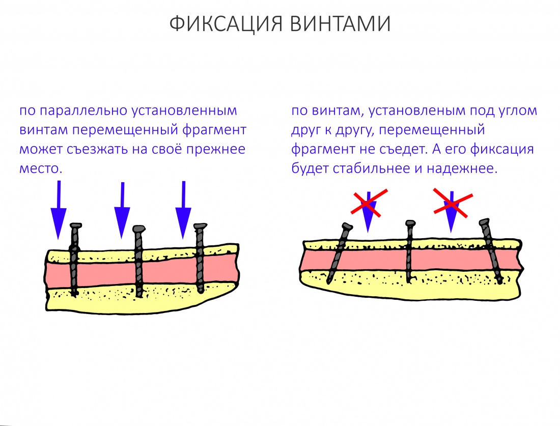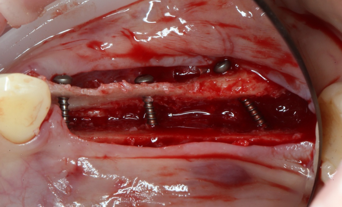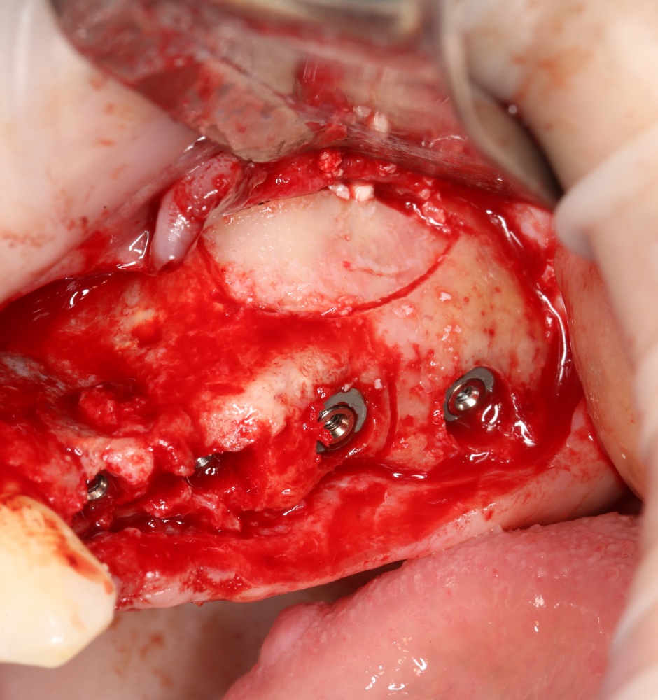 Я зафиксировал костный блок практически без адаптации на несколько винтов. Обрати внимание, что винты находятся в зоне, где не планируется установка имплантатов. Фиксация должна быть надежной, поскольку мне еще предстояла подготовка лунок для имплантатов. Трех винтов для этого вполне достаточно.