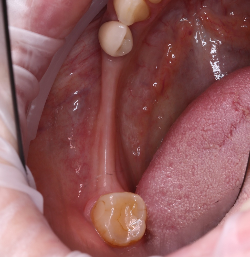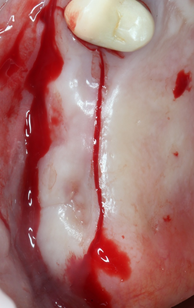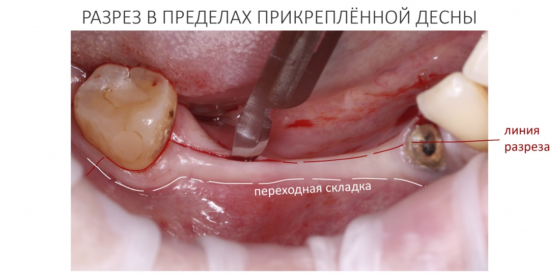 За редким исключением, мы всегда проводим разрез в пределах прикрепленной десны. Даже если её участок шириной всего полтора-два миллиметра — постарайся оставить его в этих границах.