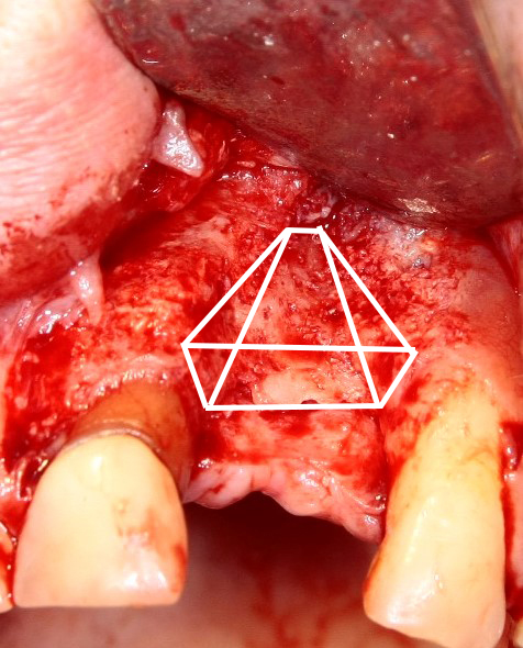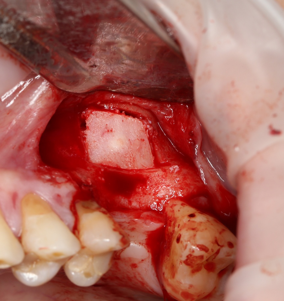 Ремарка: некоторые доктора предлагают делать хирургические шаблоны или выкройки специально для точного забора костного блока. На мой взгляд, это чрезмерное усложнение - во-первых, использование подобных шаблонов или выкроек требует увеличения площади раны, во-вторых, это увеличивает время и стоимость лечения, в-третьих, на этом этапе не требуется высокая точность, поскольку блок всё равно потребует адаптации.