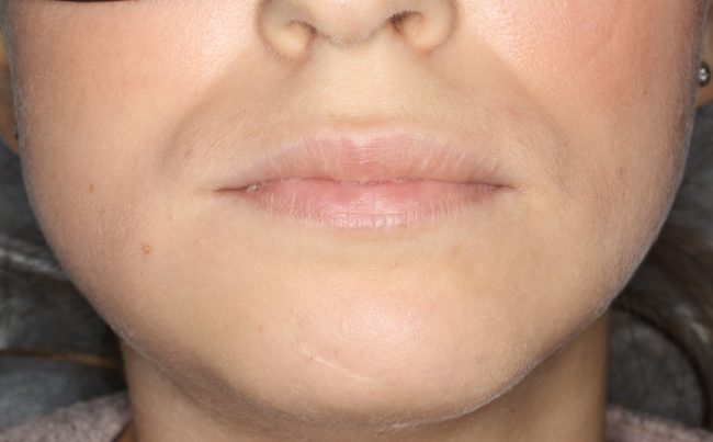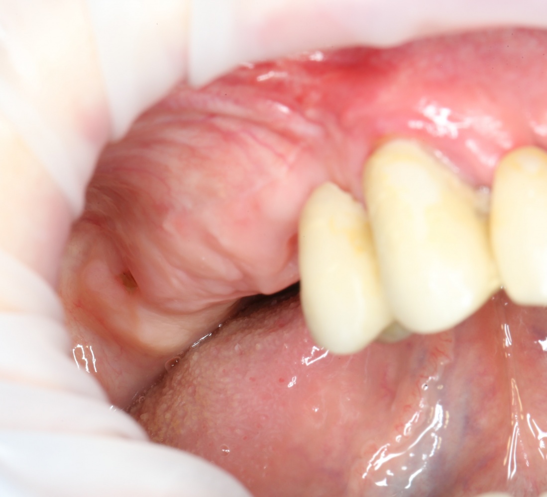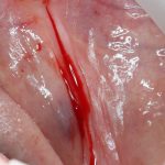 Ну хорошо. Швы сняли. Делаем разрез. Обрати внимание, что после всех проведенных операций у нас остается очень небольшой по ширине слой жевательной слизистой оболочки:
