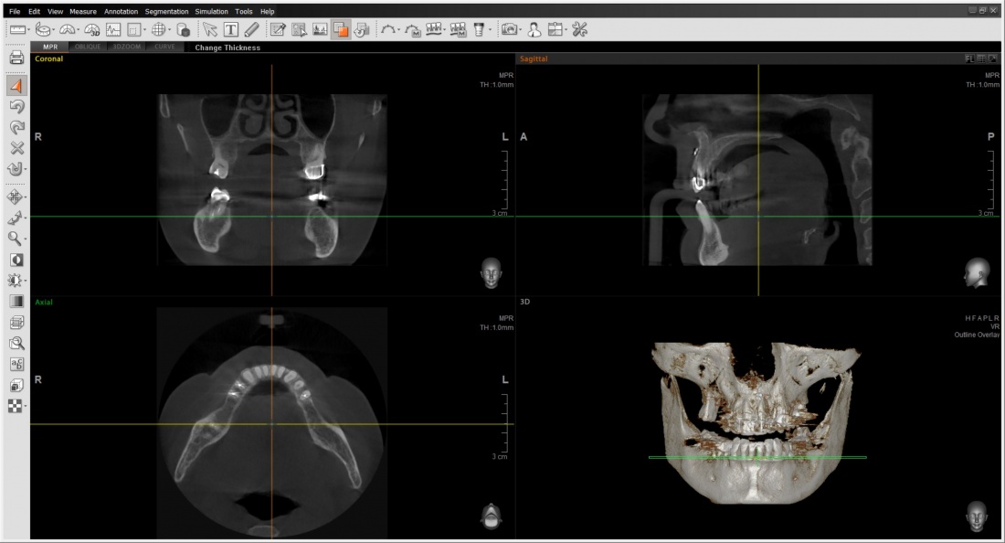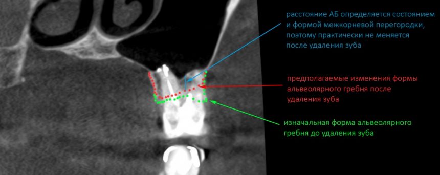 Кстати, обрати внимание на ширину альвеолярного гребня (левая картинка). Она чуть меньше 3 мм. Это объясняет, почему я засомневался в возможности установки имплантатов одновременно с остеопластикой. Понятно и без КЛКТ.