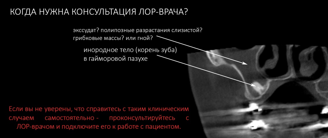 Признаюсь, не совсем понимаю необходимости назначения консультации ЛОР-врача всем пациентам поголовно. Скажем, если у пациента нет жалоб со стороны носовой полости, нет вазомоторного или аллергического ринита, на КЛКТ все носовые пазухи воздушные и чистые, их сообщение с носовой полостью не нарушено — каков смысл гонять пациента к ринологу?