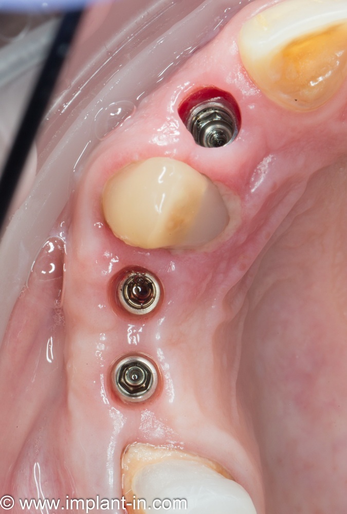Ремарка: Во всех случаях "сложной" имплантации первым делом изготавливаются временные коронки на срок до 12 месяцев. Здесь мы провели остеопластику одновременно с имплантацией - и это вполне катит за "сложную" имплантацию и требует изготовления временных коронок на минимальный срок 6 месяцев.