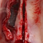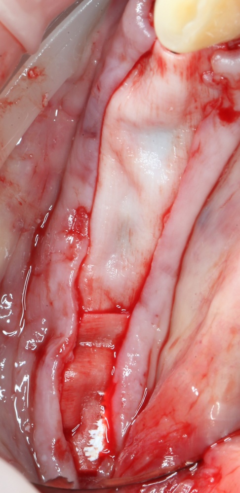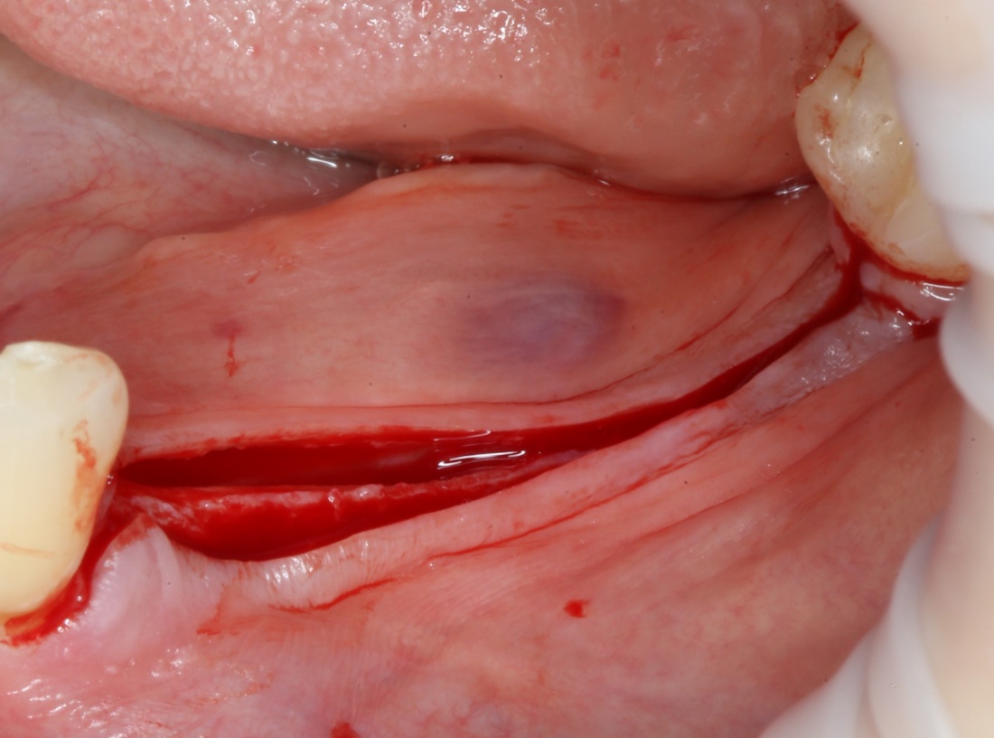 Поскольку мы планируем получать аутотрансплантат из этой же области, мы продляем разрез до донорской зоны. В этом участке удобно вывести его вестибулярно, прямо в проекции наружной косой линии.