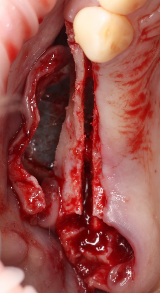 Остеотомия пролетает сразу, поскольку альвеолярный гребень такой ширины невозможно расщепить так, чтобы правильно установить имплантаты. Технически — да, но тогда имплантаты будут расположены слишком язычно, плюс риск атрофии тонкого вестибулярного фрагмента… Короче, не от случай для остеотомии.