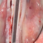 Здесь потребуется пародонтологический зонд с миллиметровой разметкой или какой-то другой измерительный прибор (операционная линейка). Ранее по КЛКТ я измерил костный дефект, теперь нужно нанести границы будущего костного блока на донорскую зону.
