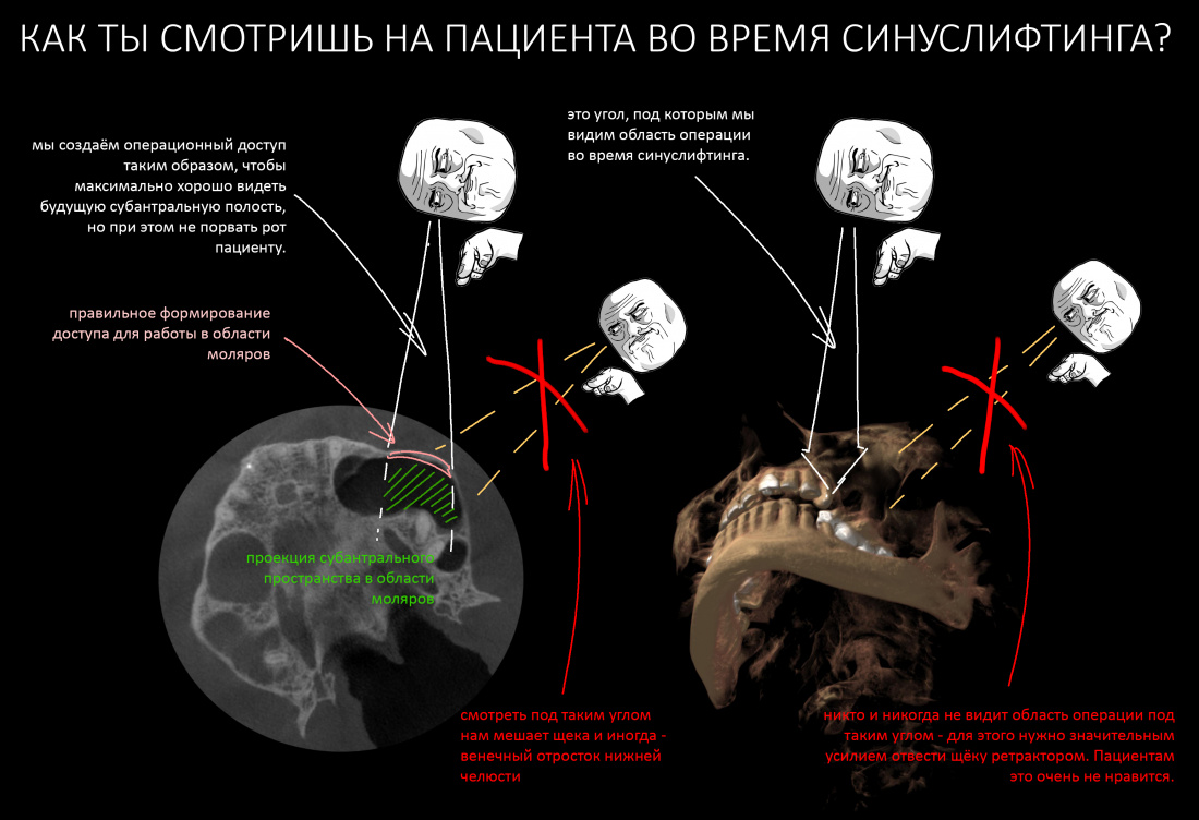 у меня появились серьезные сомнения, смогу ли я выполнить своё обещание. Вот только не спрашивай меня «Вот чо, сложно было по КЛКТ посмотреть?». Я же не спрашиваю тебя, где ты был в 2013 году, и сделал ли ты домашку. Но, в целом, план операции у нас не поменялся. Как и было оговорено, мы проведем остеопластику с одновременной имплантацией в боковом участке нижней челюсти справа.
