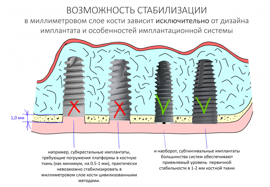Платформу субкрестальных имплантатов можно позиционировать, что называется, » с запасом» — заглубить её в кость на 3-4 мм. Даже в случае интенсивной постоперационной атрофии, она останется в правильном положении, и у нас сохранятся все условия для получения хорошего результата лечения.