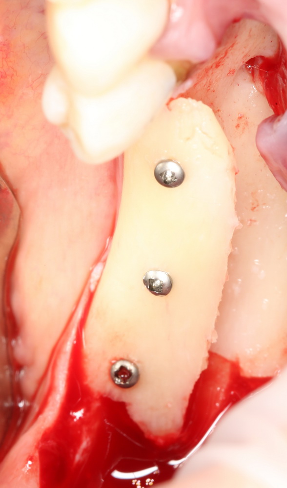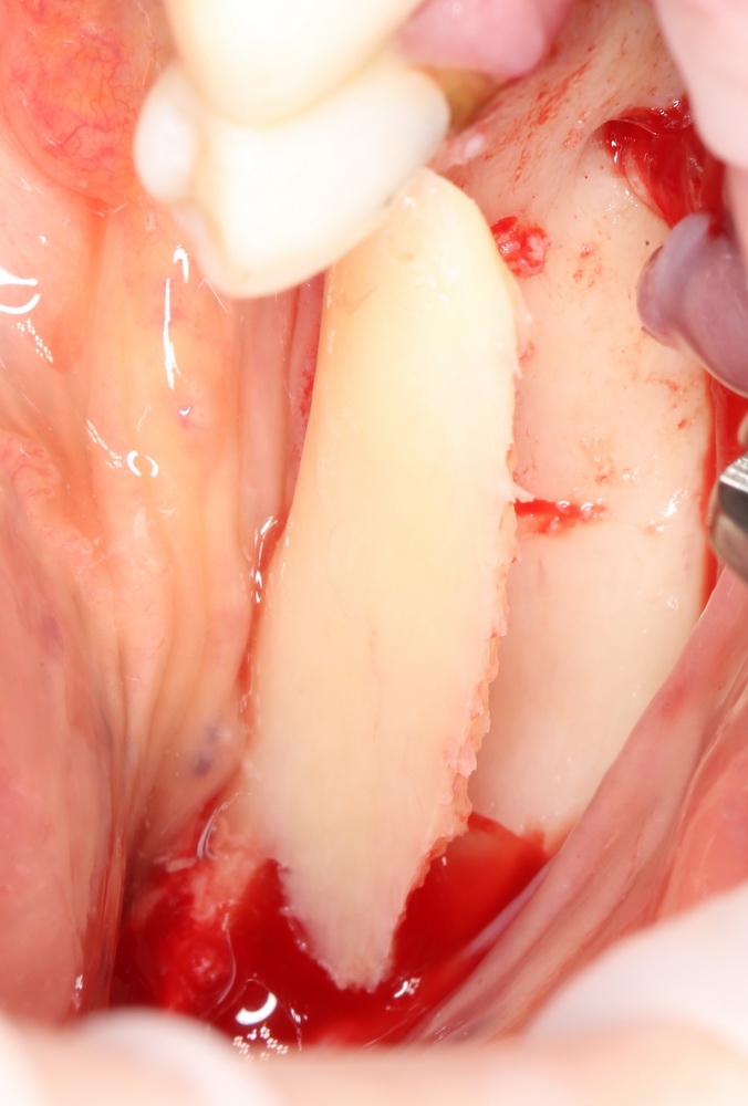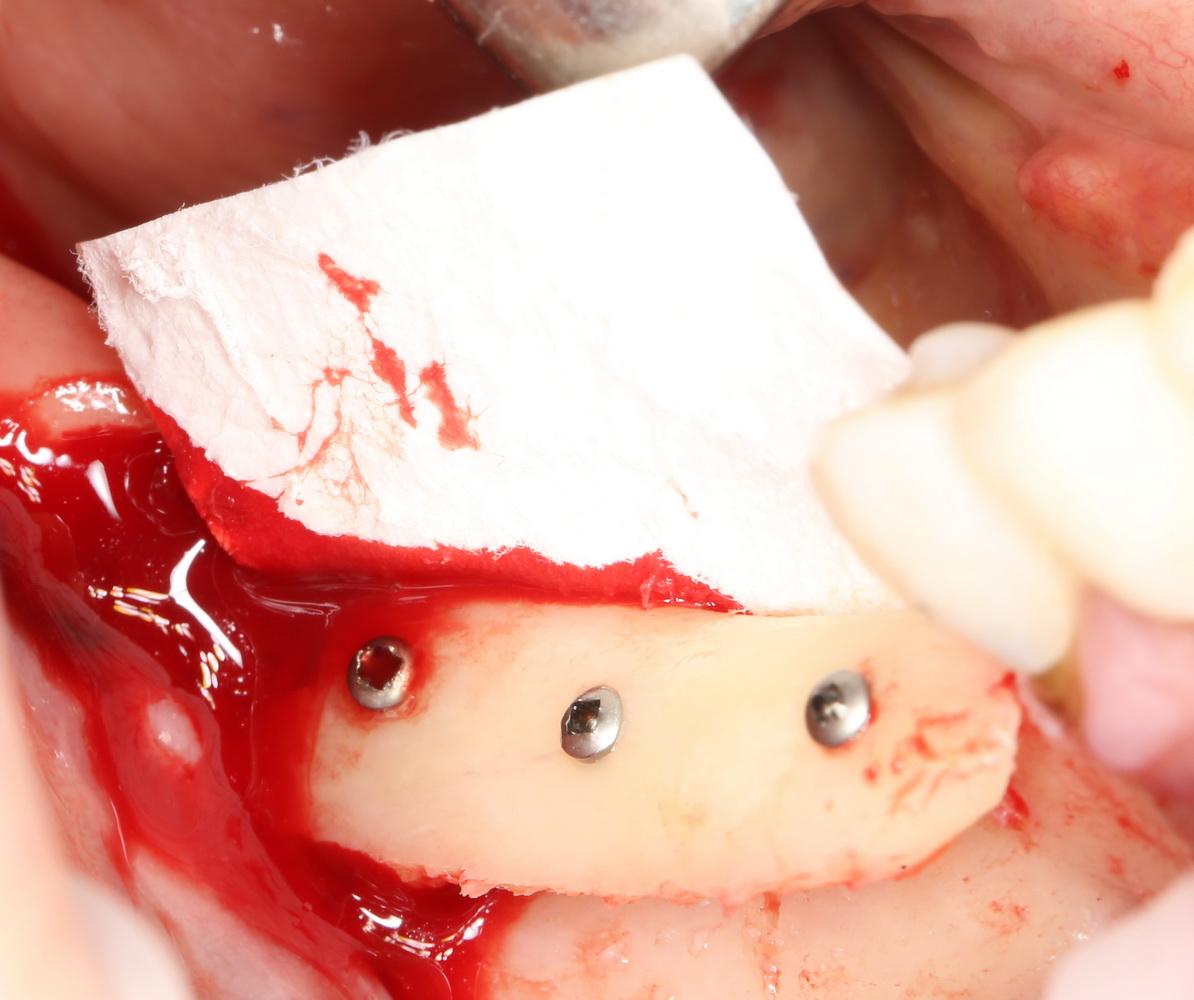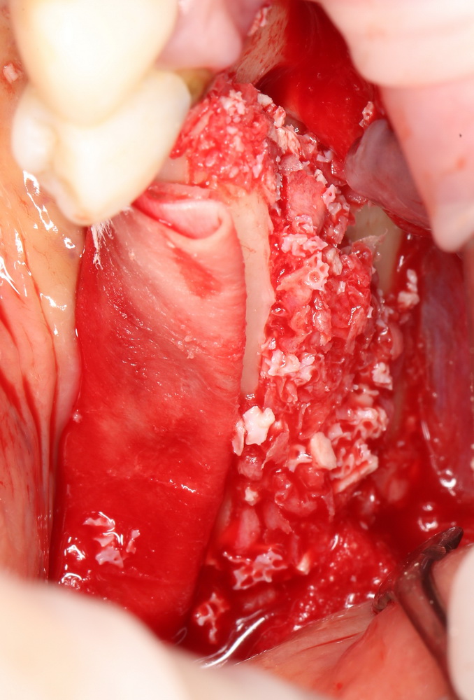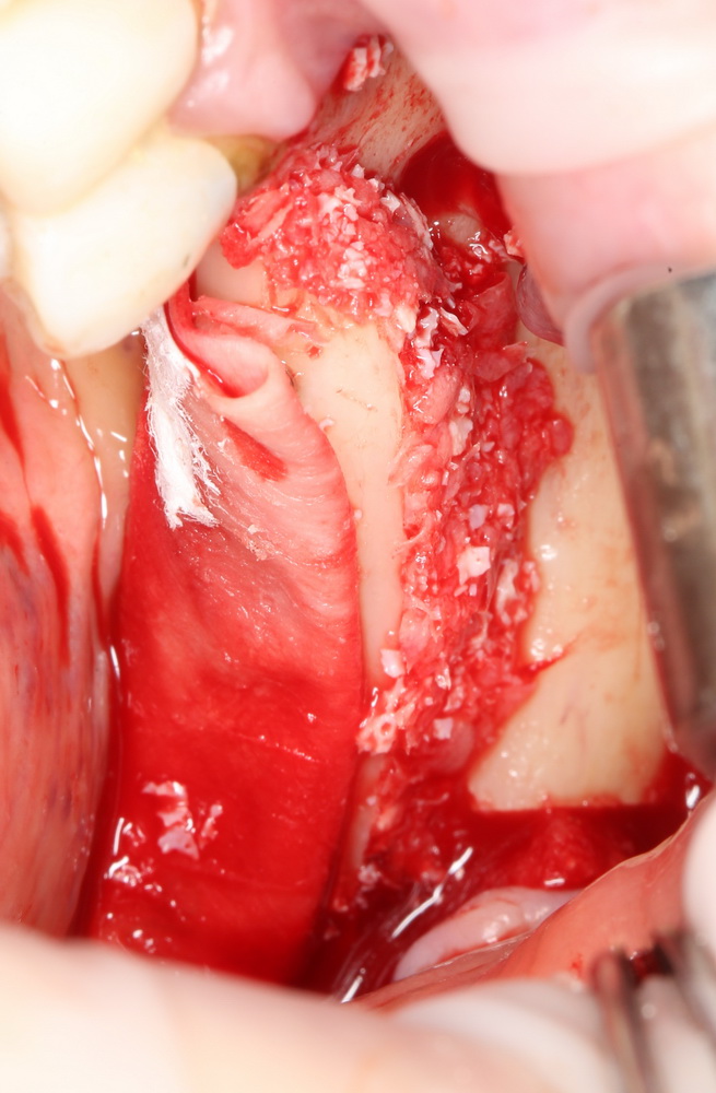А в качестве трансплантата — аутокостная стружка, которую я насобирал заранее из области угла нижней челюсти: