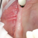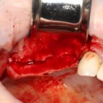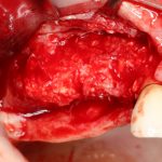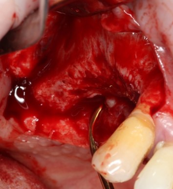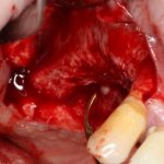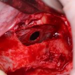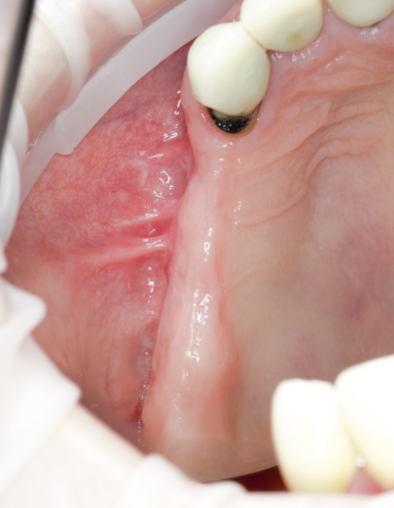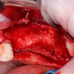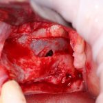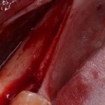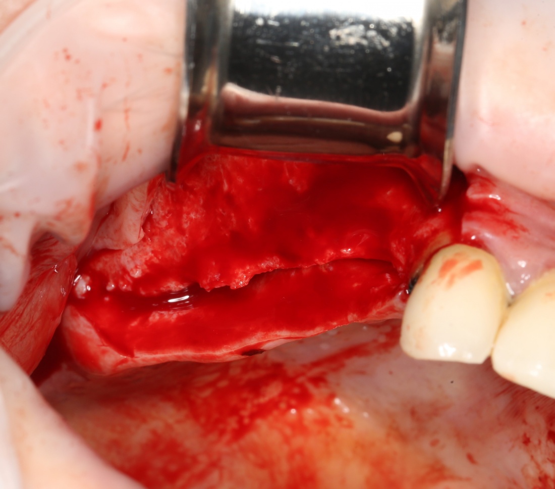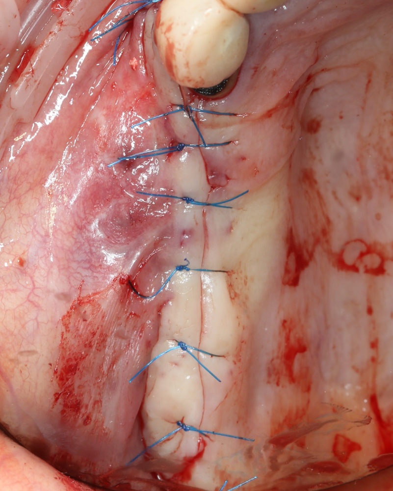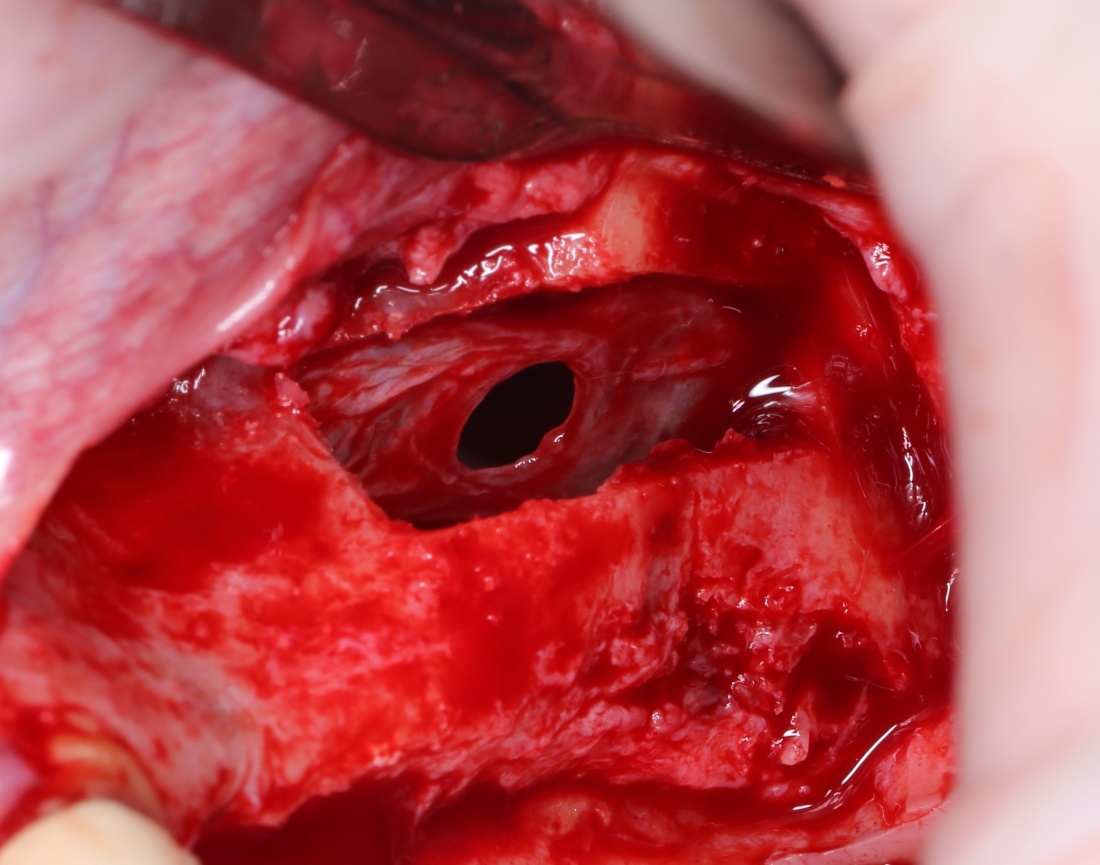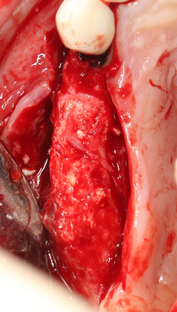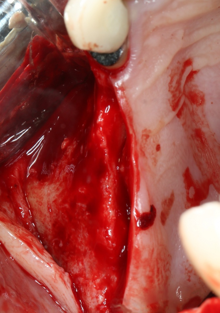 Как видите, я перенес разрез вестибулярно, примерно в проекции предполагаемого субантрального доступа. Таким образом, я получаю тот же обзор при меньшей по площади ране. Это безопаснее. Такой доступ очень просто и легко зашивается, рана заживает быстрее и с минимальным дискомфортом. Кроме того, слизистая оболочка вершины альвеолярного гребня, где мы будем потом делать следующий разрез для установки имплантов, осталась неповрежденной, мы не оставили на ней рубцов, которые могут осложнить заживление при повторном входе для установки имплантов.