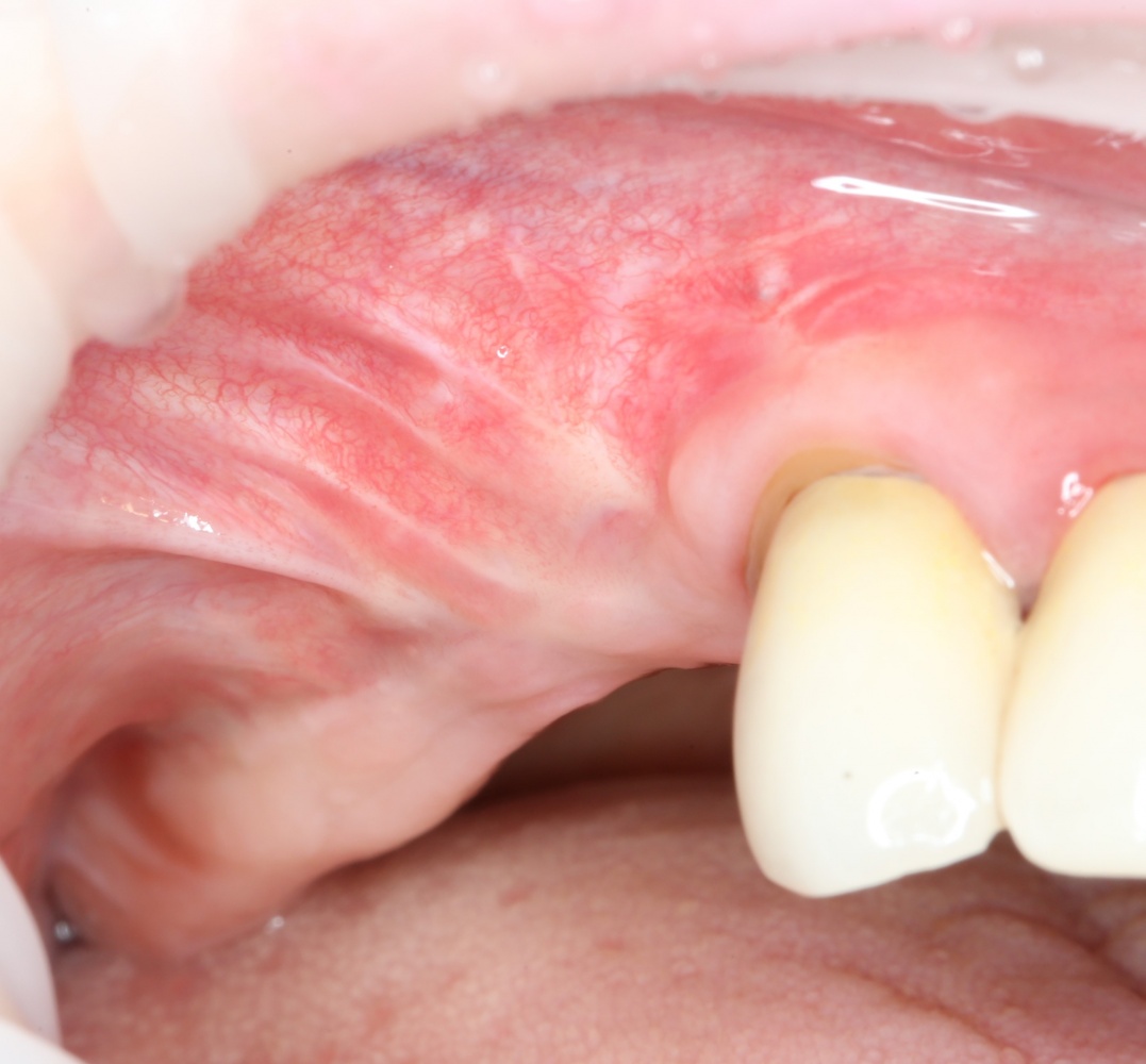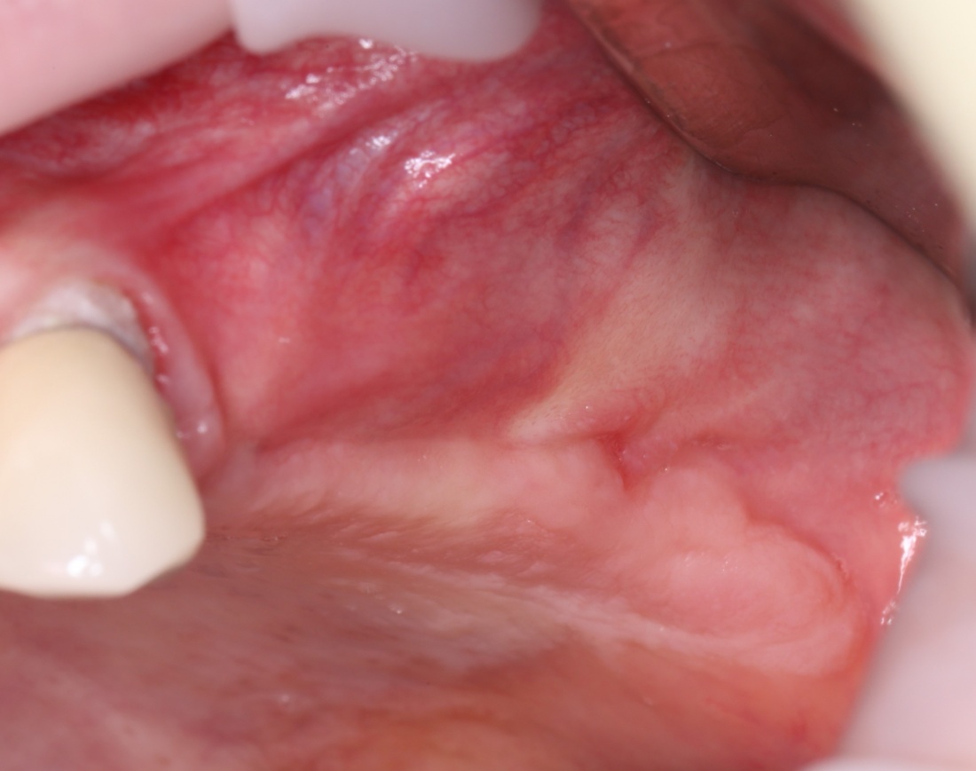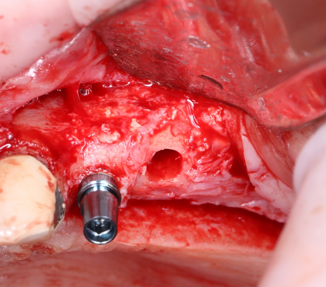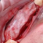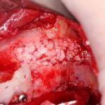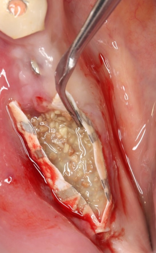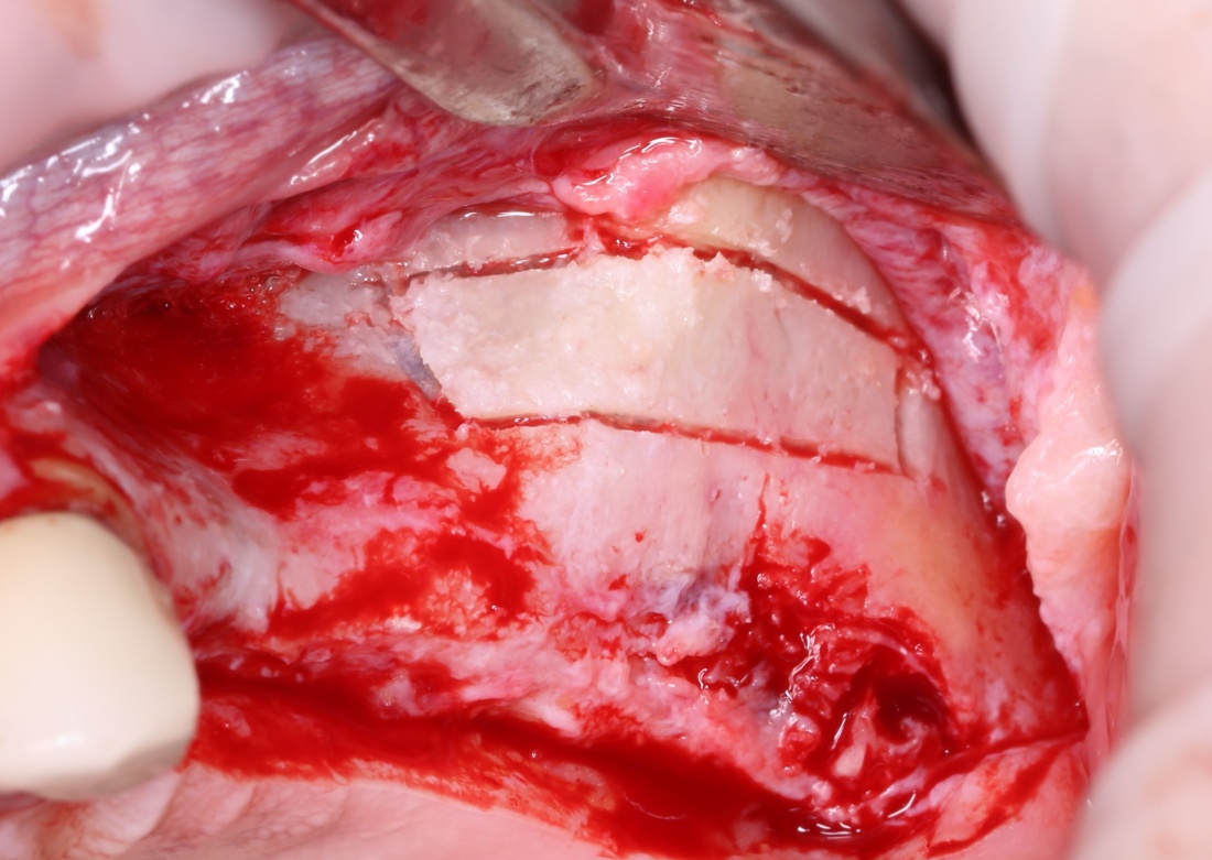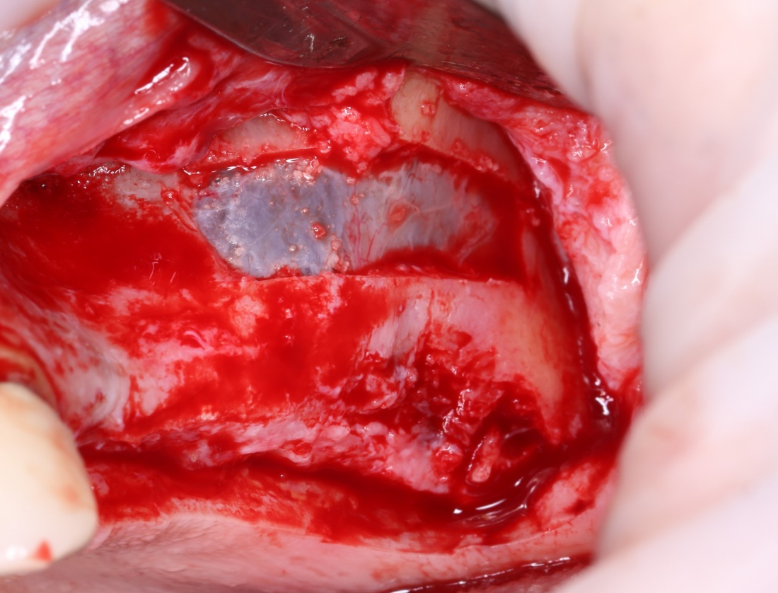 Как видите, я перенес разрез вестибулярно, примерно в проекции предполагаемого субантрального доступа. Таким образом, я получаю тот же обзор при меньшей по площади ране. Это безопаснее. Такой доступ очень просто и легко зашивается, рана заживает быстрее и с минимальным дискомфортом. Кроме того, слизистая оболочка вершины альвеолярного гребня, где мы будем потом делать следующий разрез для установки имплантов, осталась неповрежденной, мы не оставили на ней рубцов, которые могут осложнить заживление при повторном входе для установки имплантов.