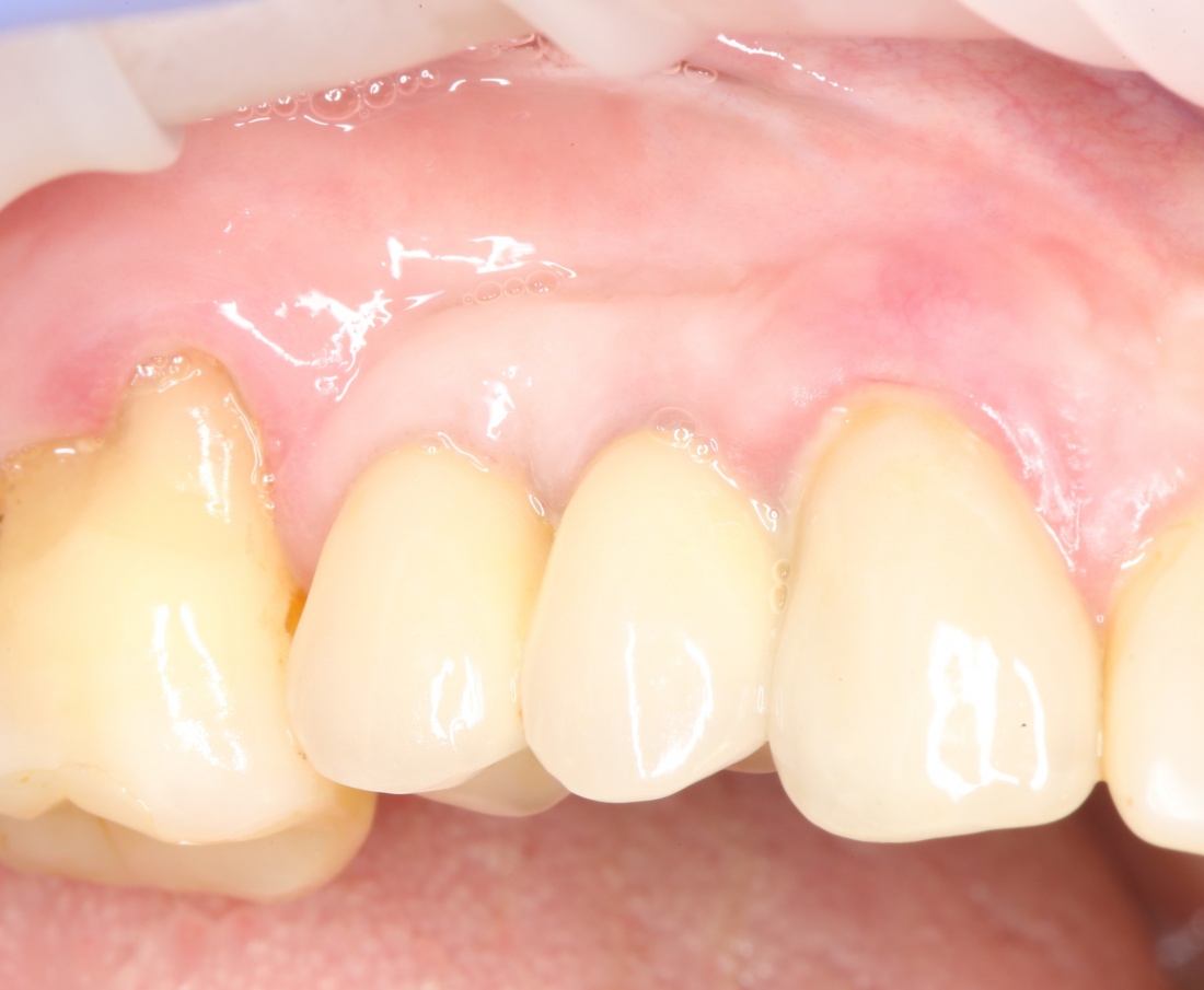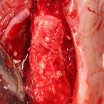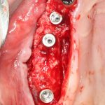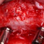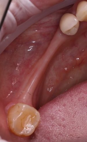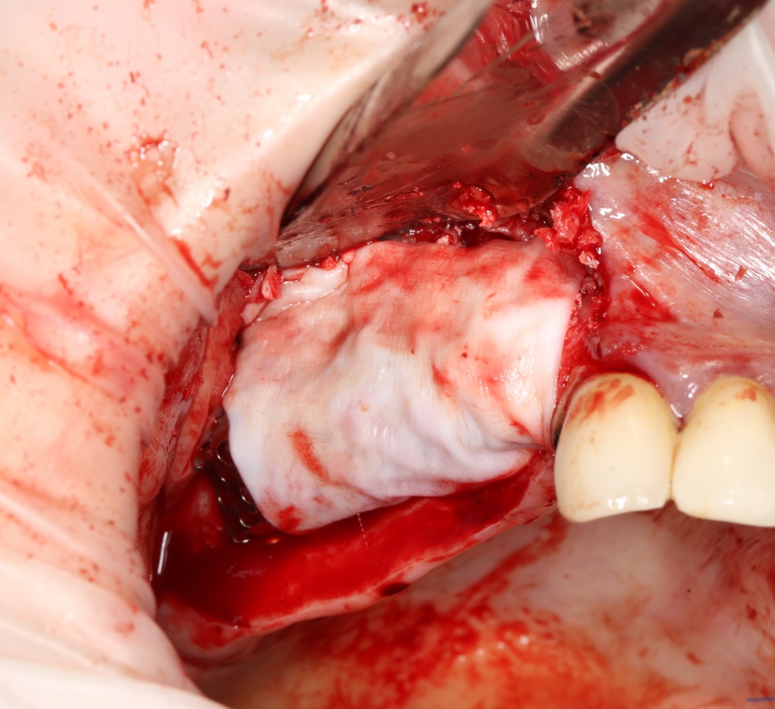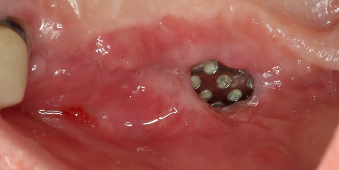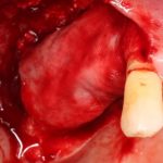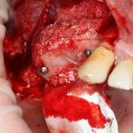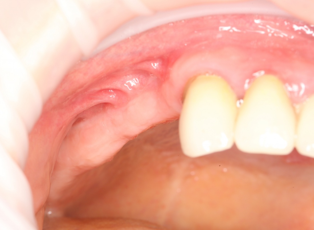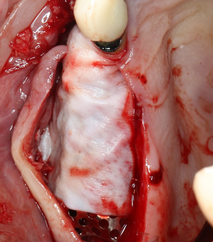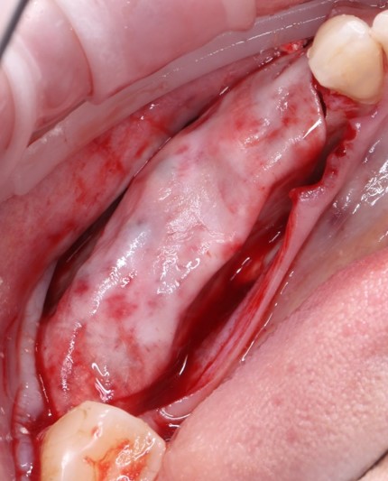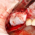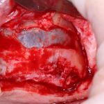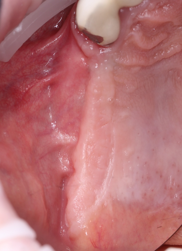 Как видите, я перенес разрез вестибулярно, примерно в проекции предполагаемого субантрального доступа. Таким образом, я получаю тот же обзор при меньшей по площади ране. Это безопаснее. Такой доступ очень просто и легко зашивается, рана заживает быстрее и с минимальным дискомфортом. Кроме того, слизистая оболочка вершины альвеолярного гребня, где мы будем потом делать следующий разрез для установки имплантов, осталась неповрежденной, мы не оставили на ней рубцов, которые могут осложнить заживление при повторном входе для установки имплантов.